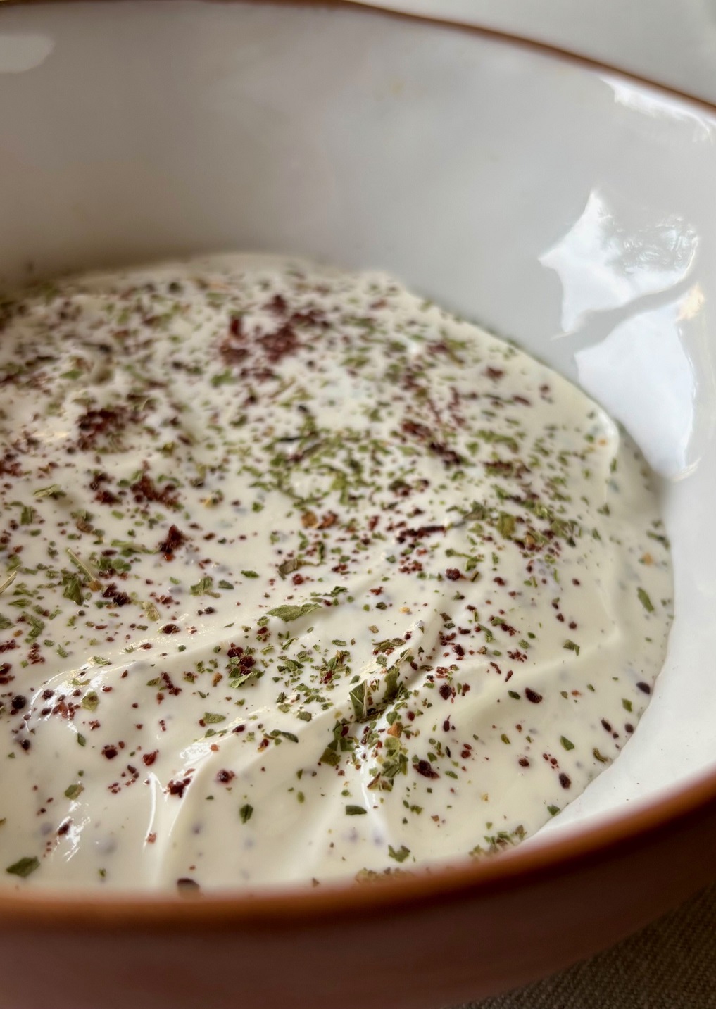 Ανακατεύουμε 1 κεσέ στραγγιστό γιαούρτι με λίγο αλάτι, 1 κ.γλ. ξερό δυόσμο και 1 κ.γλ. sumac. Βρίσκουμε sumac σε καταστήματα μπαχαρικών, delicatessen και έθνικ παντοπωλεία. Αν δεν έχετε, μπορείτε να το αντικαταστήσετε με κύμινο ή κόλιανδρο, με διαφορετικό αρωματικό αποτέλεσμα.