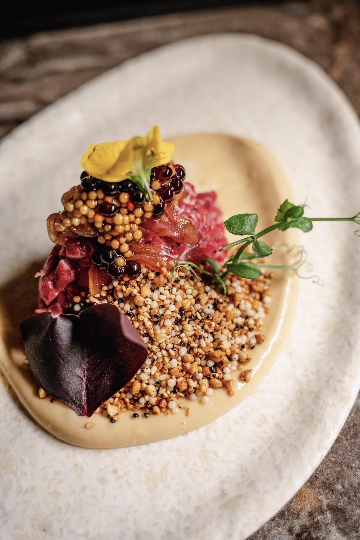 Ακολούθησε το ταρτάρ μόσχου (17€) με καραμελωμένο κρεμμυδάκι, πίκλα από σινάπι που ήταν υπαίτια για πάμπολλες οργασμικές εκρήξεις στον ουρανίσκο μας, μαγιονέζα βαλσάμικου και δημητριακά. Η μαγιονέζα βαλσάμικο έδωσε μια ραφινάτη κι ελαφρώς όξινη νότα στο πιάτο αναδεικνύοντας ακόμη περισσότερο τις δημιουργικές του αρετές.