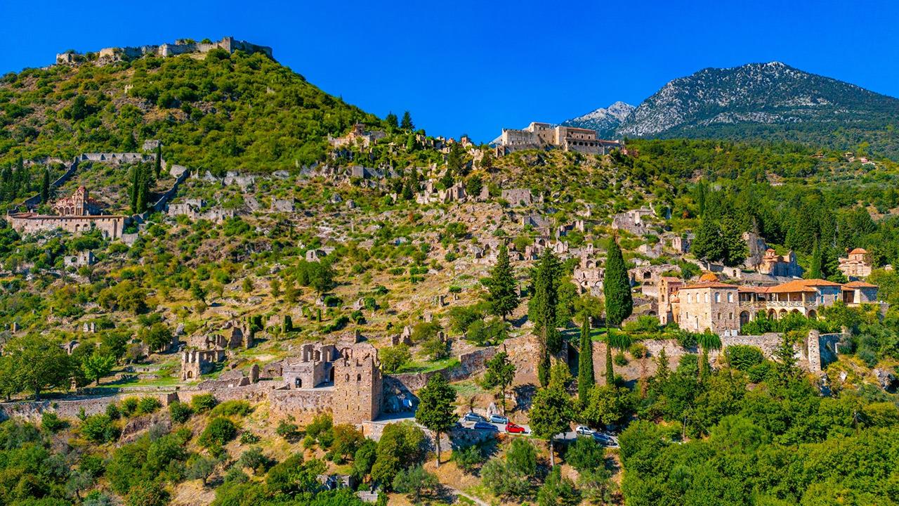 Σκαρφαλωμένη σε μια από τις πλαγιές του Ταΰγετου, 5 χιλιόμετρα έξω από την Σπάρτη, η αλλοτινή πρωτεύουσα του βυζαντινού δεσποτάτου του Μορέως, αυτή που έστεψε τον τελευταίο αυτοκράτορα, τον Κωνσταντίνο «που την έχασε» τον Παλαιολόγο, είναι σήμερα ένας φαντασμαγορικός αρχαιολογικός χώρος, διάσπαρτος με βυζαντινές εκκλησίες και μοναστήρια, πέτρινα τείχη, λιθόκτιστα μονοπάτια και ένα κάστρο να στεφανώνει και να εποπτεύει τα πάντα από ψηλά.