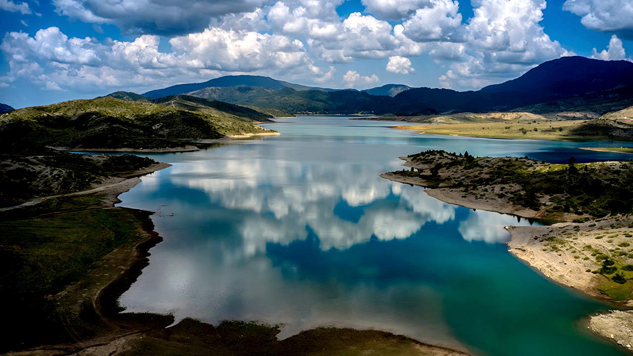 Η τεχνητή λίμνη δημιουργήθηκε το 1987 με την κατασκευή του υδροηλεκτρικού φράγματος του Αώου και βρίσκεται στους πρόποδες του Μαυροβουνίου, σε υψόμετρο περίπου 1.350 μέτρων. Αν και ανθρώπινο δημιούργημα, με την πάροδο του χρόνου ενσωματώθηκε πλήρως στο φυσικό περιβάλλον και εξελίχθηκε σε ένα σημαντικό οικοσύστημα, με πλούσια χλωρίδα και πανίδα. Τα γαλάζια νερά της, άλλοτε ήρεμα και άλλοτε σκοτεινά, περιβάλλονται από πυκνά παρόχθια δάση, δημιουργώντας ένα τοπίο γαλήνιο αλλά ταυτόχρονα επιβλητικό.