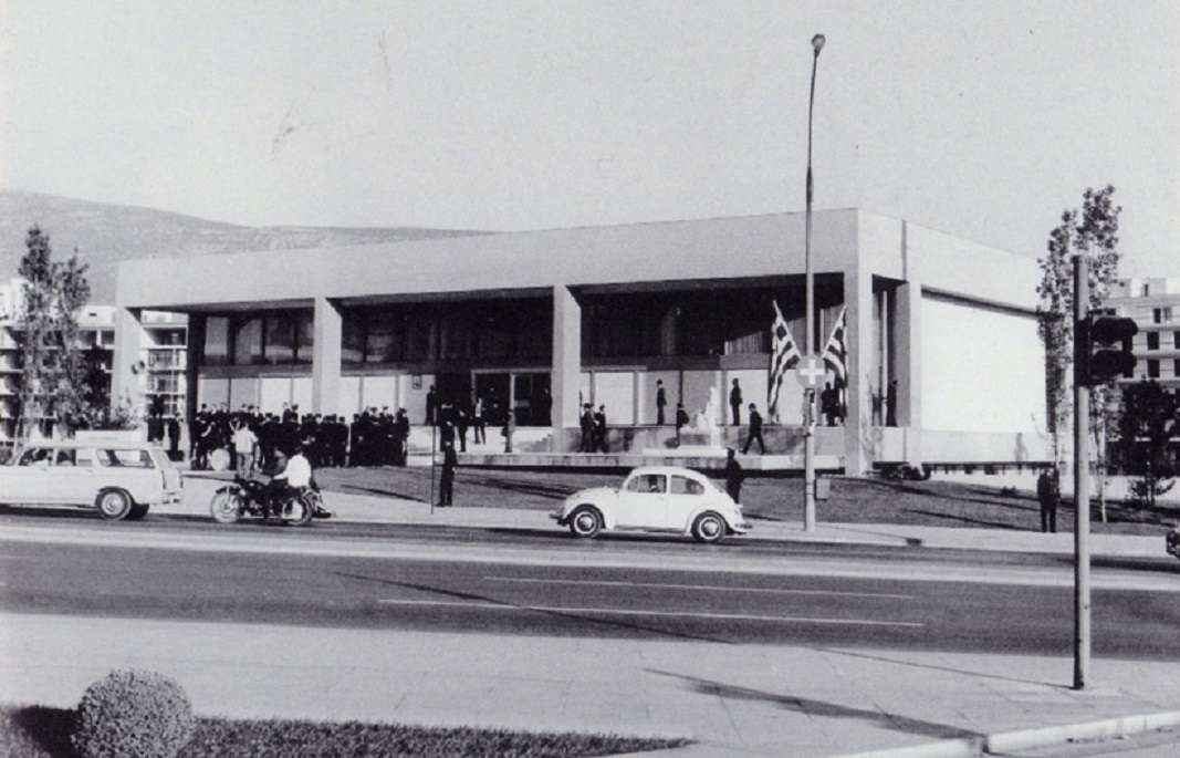 Μπορεί να μοιάζει πια αγνώριστη, αν όμως κοιτάξεις προσεκτικά, θα την δεις: Η αρχική μορφή της με τους κυβικούς όγκος από μπετόν είναι ακόμα εκεί, αριστουργηματικά ενσωματωμένη στο κτίριο που ξέρεις σήμερα. Το σχέδιο ήταν των Παύλου Μυλωνά και Δημήτρη Φατούρου, με συνεργάτη αρχιτέκτονα τον Δημήτρη Αντωνακάκη, που επιλέχθηκαν ανάμεσα σε 40 προτάσεις τις οποίες κατέθεσαν 75 αρχιτέκτονες στον διαγωνισμό που προκηρύχθηκε το 1956. Η φωτογραφία που βλέπεις επάνω είναι από τα εγκαίνια του 1976 (εδώ βίντεο από το αρχείο της ΕΡΤ).