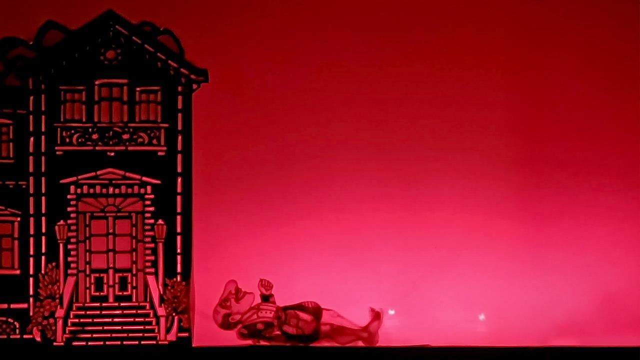 Στο δεύτερο μέρος του Στοιχειωμένου Πανδοχείου, εκεί που το μυστήριο πυκνώνει και ο δολοφονηθής πανδοχέας επιστρέφει σαν άλλος πατέρας του Άμλετ για να ζητήσει εκδίκηση, ο μπερντές φωτίζεται κατακόκκινος. Κι είναι ένα φως μυστηριακό, που φτιάχνει ατμόσφαιρα, και κάνει τέλεια αντίθεση με το ολόμαυρο, χειροποίητο σκηνικό του πανδοχείου. Όσο θέατρο σκιών και αν έχεις δει στην προηγούμενη, την παιδική ζωή σου, αυτό εδώ δεν μοιάζει με τίποτα.