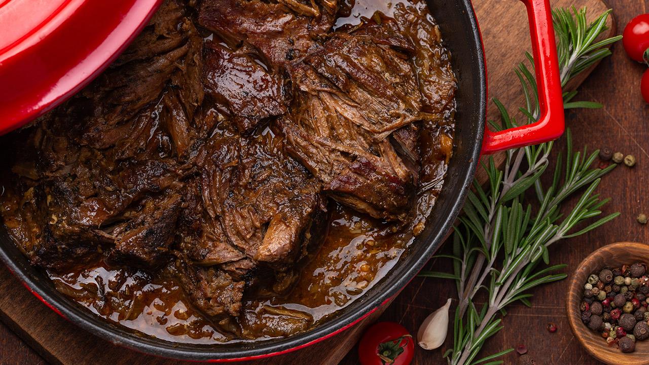 Ζεσταίνουμε το ελαιόλαδο και σοτάρουμε το κρέας για 5–7 λεπτά μέχρι να πάρει χρώμα. Προσθέτουμε το κρεμμύδι και το σκόρδο, σβήνουμε με το κρασί και αφήνουμε 2–3 λεπτά να εξατμιστεί. Ρίχνουμε τη ντομάτα, τα μπαχαρικά, αλάτι και πιπέρι, σκεπάζουμε και ψήνουμε στους 160–170°C για 2–2,5 ώρες, μέχρι να μαλακώσει και να δέσει.
