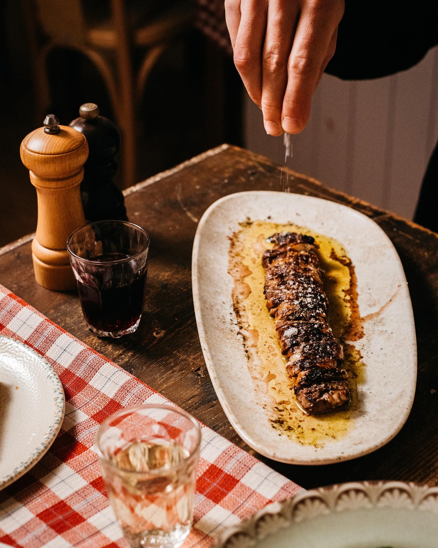 Πήραμε θέση στο τραπεζάκι μας και παραγγείλαμε το ροζέ χύμα κρασάκι μας (5€ το μισό κιλό) πριν το ρίξουμε στη μελέτη του καταλόγου που έκρυβε μπόλικες ως επί το πλείστον κρεατολιχουδιές. Το ρολόι έδειχνε πλέον 20:30 κι όλα τα τραπέζια είχαν γεμίσει με τις προπόσεις να δίνουν και να παίρνουν ενόσω το σέρβις σε ρυθμούς σκυταλοδρομίας ανανέωνε τα πιάτα κάθε παρέας, με βάση τις παραγγελίες τους. Από τη δική μας παραγγελία πρώτη ήρθε η σαλάτα «του Γάτου» (6€) με λάχανο, καρότο, πιπεριά Φλωρίνης, καπνιστή πάπρικα και καυτερή πιπεριά. Μια πικάντικη salad εκδοχή με ολίγη από πολίτικη σαλάτα, που τέσταρε τις αντοχές των πιο ευαίσθητων ουρανίσκων αλλά σε αντάμειβε αν της έδινες τον απαραίτητο χρόνο, συνοδεύοντας με το αφράτο ψωμάκι που έπαιρνε την πρώτη κάψα.