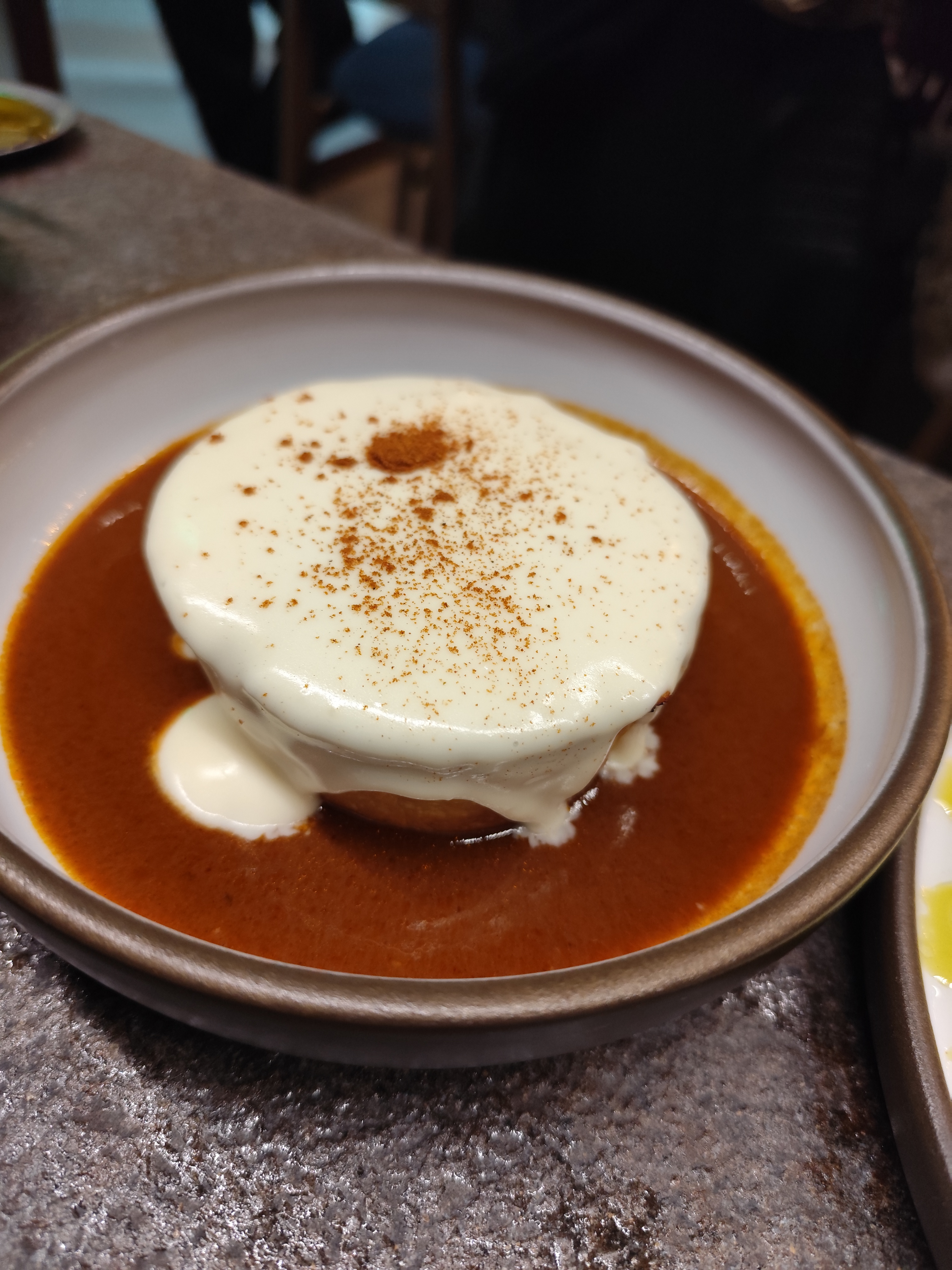 To καρπάτσιο γαρίδας (26€) ήρθε με γάμπαρη από τον Πλαταμώνα, βουτηγμένο σε βιολογικό ελαιόλαδο, ανθό αλατιού και μοσχολέμονο και μας παρέσυρε με τη μεσογειακή γοητεία του. Η συνέχεια μας έκρυβε δύο από τα πιάτα για τα οποία παραμιλά δικαίως όλη η Αθήνα. Πρώτο ήρθε το πολυταγκαρισμένο πλέον cinnamon roll με γέμιση κιμά από κόκκορα (17€), κρέμα μετσοβόνε, πούδρα από το ασυναγώνιστο κερκυραϊκό μείγμα μπαχαρικών σπετσέρικο και μια σάλτσα παστιτσάδας, για να ικανοποιηθεί η καλοφαγάδικη ανάγκη της βούτας. Το cinnamon roll είχε υποστεί αντίστοιχη επεξεργασία με λιγότερη ζάχαρη φυσικά, μα η μαεστρία του πιάτου φάνηκε στην υπέροχη σάλτσα που απαιτεί κόπο και βαθιά γνώση του αντικειμένου για να παρουσιαστεί σε τέτοια γευστική αρμονία.