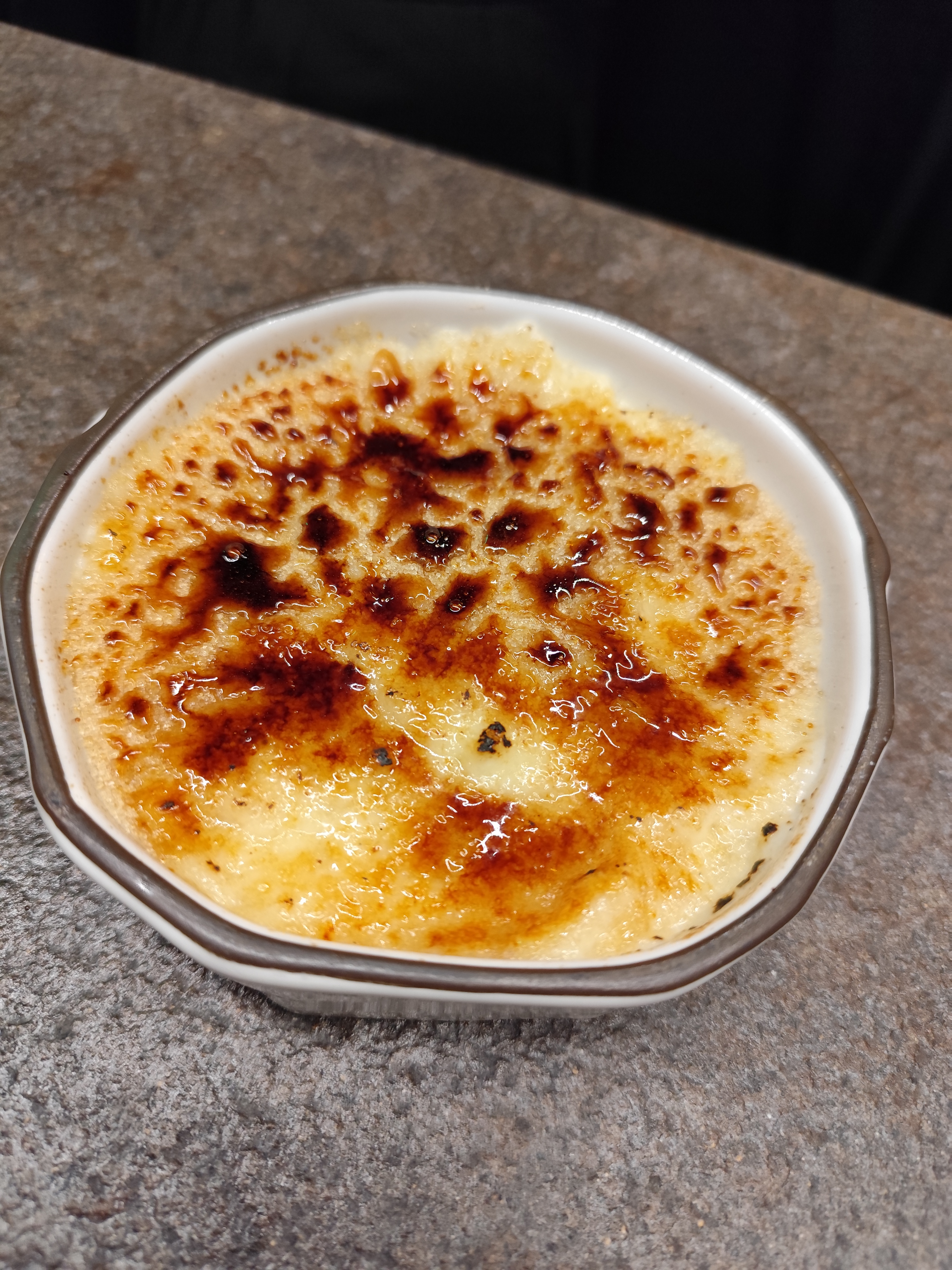 Το επιδόρπιο έκρυβε ένα ρυζόγαλο crème brulee (10€) με καραμέλα, τζίντζερ και βανίλια που ήρθε και φλογίστηκε επίσης εμπρός μας ξύπνησε όλες εκείνες τις παιδικές γλυκές αναμνήσεις οι οποίες χωρούσαν σε ένα πήλινο κεσεδάκι.
