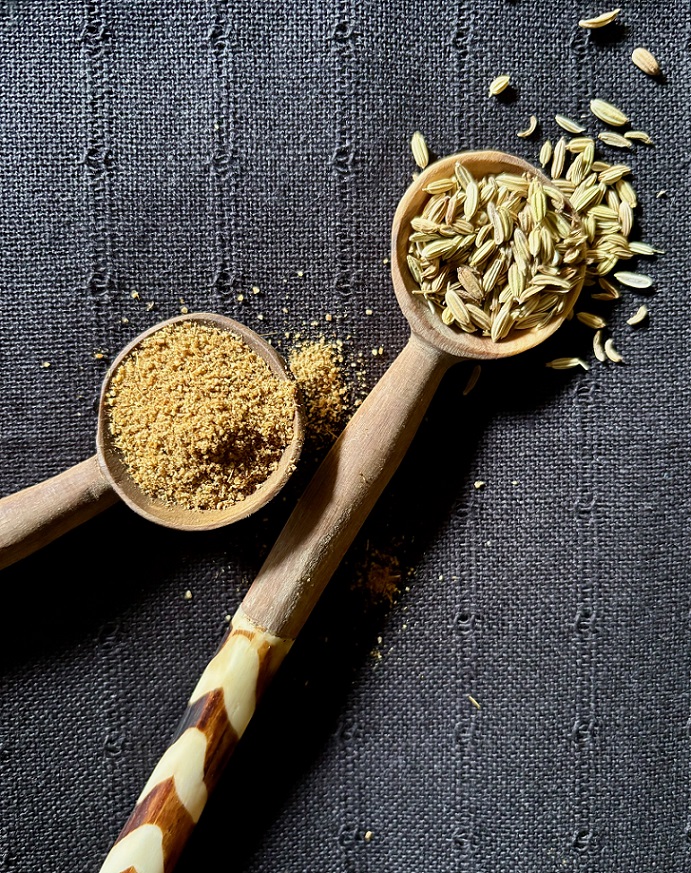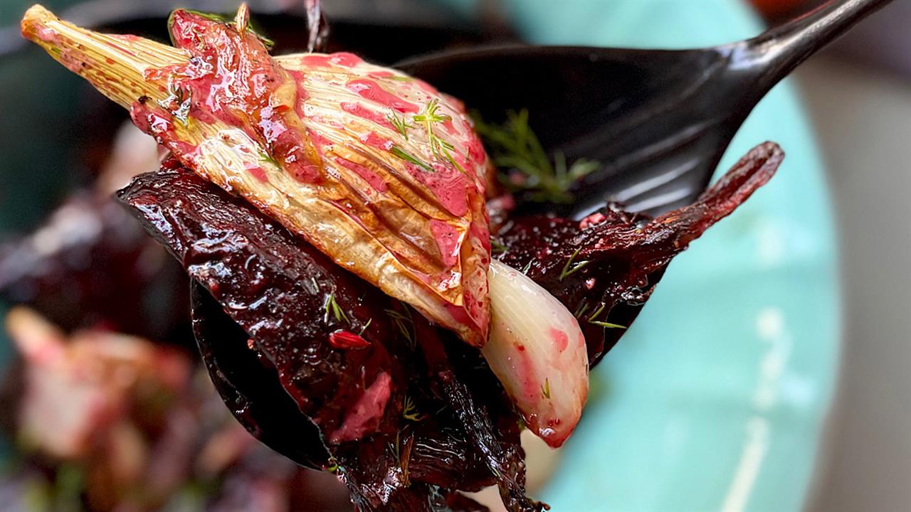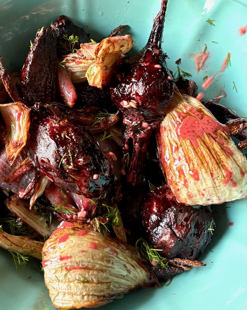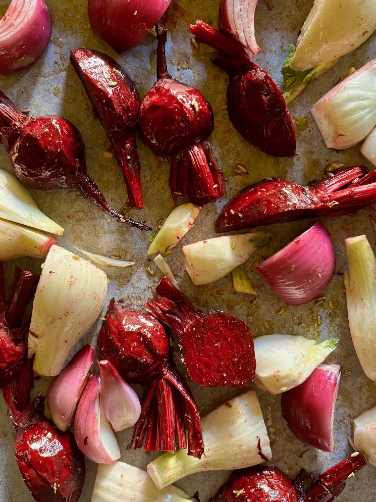 Προθερμαίνουμε τον φούρνο στους 190ο C. Στρώνουμε τη λαμαρίνα του φούρνου με λαδόκολλα και αραδιάζουμε σε μονή στρώση 6 παντζάρια ξεφλουδισμένα και κομμένα στα δύο, 2 μαραθόριζες (φινόκιο) κομμένες στα 4 (φυλάμε τις πράσινες φουντίτσες για τη σαλάτα) και ένα μεγάλο ξερό κρεμμύδι κομμένο στα 6. Αλατοπιπερώνουμε και ανακατεύουμε καλά. Ραντίζουμε με εξαιρετικό παρθένο ελαιόλαδο και πασπαλίζουμε με ολόκληρους μαραθόσπορους και τριμμένο κύμινο. Φουρνίζουμε για περίπου 30΄ μέχρι να μαλακώσουν τα λαχανικά και να καψαλιστούν εξωτερικά.