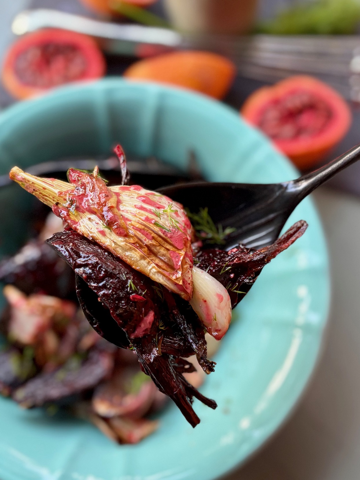 Την ιδέα για τη σαλάτα που θα σας δείξω σήμερα μου έδωσαν τα εκτυφλωτικά σαγκουίνια που κάθε χρόνο περιμένω πώς και πώς. Δεν είναι μόνο όμορφα, είναι και εξαιρετικά μυρωδάτα, με μια ελαφριά πικράδα όλο φινέτσα. Λένε πως έχουν και μεγαλύτερη θρεπτική αξία από τα κοινά πορτοκάλια, περισσότερη βιταμίνη C, αντιοξειδωτικά στοιχεία λόγω της ανθοκυανίνης που είναι αυτή που ευθύνεται για το βαθύ κόκκινο, αιμάτινο χρώμα τους, ακόμα και λιποδιαλυτική ιδιότητα. Αλήθεια ή όχι, δεν έχει και μεγάλη σημασία γιατί το κάθε φρούτο και λαχανικό δίνει και από κάτι πολύτιμο. Τα χειμωνιάτικα λαχανικά από την άλλη, καθώς μελώνουν και καψαλίζονται, αποκτούν πολλά επίπεδα γεύσης και υφής, κάνοντας τη σαλάτα ένα πρώτης τάξεως συνοδευτικό για οποιαδήποτε πρωτεΐνη διαλέξουμε για το γεύμα μας.