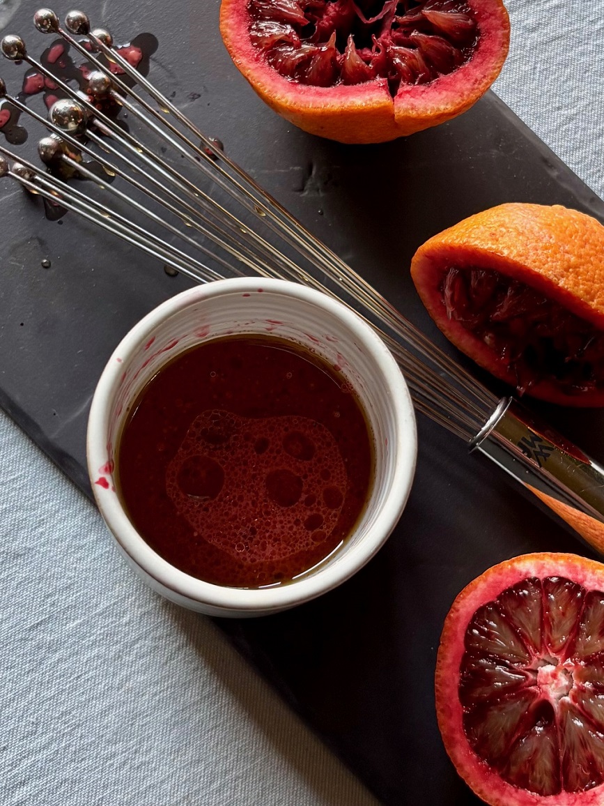 Όσο ψήνονται τα λαχανικά ετοιμάζουμε το dressing με 1 γεμάτο κ.γλ. μουστάρδα της αρεσκείας μας, τον χυμό από 2 πορτοκάλια σανγκουίνια, αλατοπίπερο και εξαιρετικό παρθένο ελαιόλαδο. Ανακατεύουμε καλά.