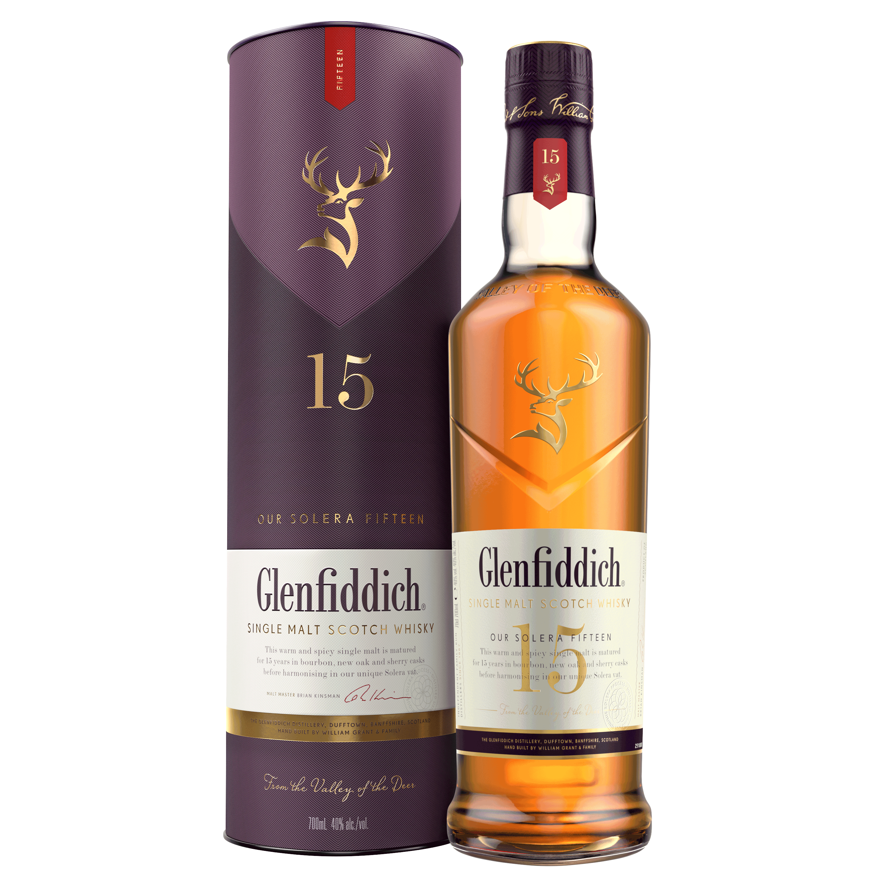 Το Glenfiddich 15 Year Old είναι ένα single malt που συνοψίζει ιδανικά τη φιλοσοφία του αποστακτηρίου: σεβασμός στην παράδοση, αλλά και διάθεση για πειραματισμό.Πρόκειται για το πιο πολυβραβευμένο single malt ουίσκι στον κόσμο, με κληρονομιά από το 1887 και ξεχωρίζει παγκοσμίως για την απαράμιλλη ποιότητα, τη δεξιοτεχνία ωρίμανσης και τον εκλεπτυσμένο χαρακτήρα του. Παράγεται αποκλειστικά από βυνοποιημένο κριθάρι, νερό και μαγιά, σε ένα και μόνο αποστακτήριο της καρδιάς του Speyside, και ωριμάζει για δεκαπέντε χρόνια σε έναν προσεκτικά επιλεγμένο συνδυασμό βαρελιών από αμερικανικό bourbon, ευρωπαϊκό sherry και νέα δρύινατα οποία ενώνονται στο εμβληματικό Solera Vat – ένα χειροποίητο βαρέλι που δεν αδειάζει ποτέ.