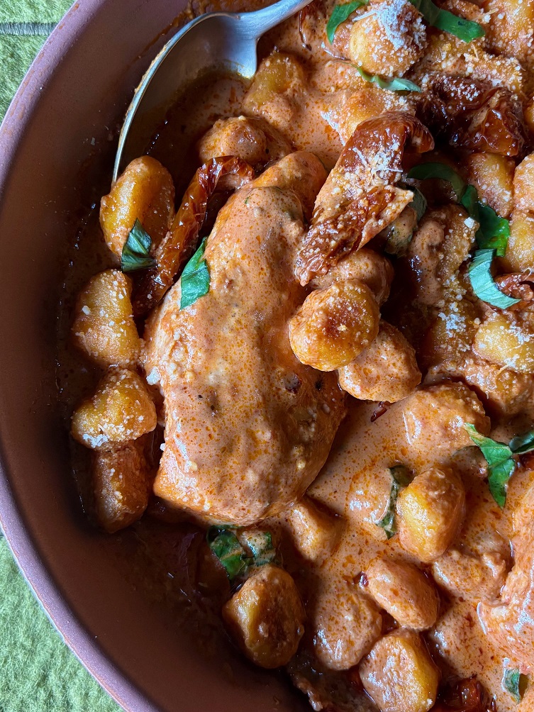 Στεγνώνουμε επιμελώς 2 φιλέτα στήθος κοτόπουλου χωρίς πέτσα με απορροφητικό χαρτί και τα αλατοπιπερώνουμε (έχουμε φροντίσει να τα βγάλουμε από το ψυγείο 30΄ τουλάχιστον πριν από το μαγείρεμα). Σοτάρουμε τα φιλέτα στο ίδιο τηγάνι (πιθανότατα θα χρειαστεί να προσθέσουμε λίγη ακόμη λιπαρή ουσία γιατί τη μεγαλύτερη ποσότητα θα έχουν απορροφήσει τα νιόκι) μέχρι να πάρουν καλό χρώμα από όλες τις πλευρές, για περίπου 5΄ από κάθε πλευρά, μην παραλείποντας τα πλαϊνά. Γυρνάμε τα φιλέτα με λαβίδα ή 2 κουτάλια κι όχι με πιρούνι γιατί το τρύπημα θα έχει σαν αποτέλεσμα το κρέας να χάσει τους χυμούς του. Αφαιρούμε τα φιλέτα από το τηγάνι και αφού χαμηλώσουμε λίγο τη φωτιά, βάζουμε 1 κ.σ. πελτέ ντομάτας, 1 πρέζα ξερή ρίγανη, 1-2 πρέζες μπούκοβο και ανακατεύουμε για λίγο μέχρι να σκουρύνει ο πελτές. Προσθέτουμε 1 σκ. σκόρδου λεπτοτριμμένη και σοτάρουμε για λίγα δευτερόλεπτα. Μόλις μυρίσει το σκόρδο προσθέτουμε 1 μικρό ποτήρι λευκό ξηρό κρασί και ξύνουμε ελαφρά τον πάτο του τηγανιού με ξύλινη κουτάλα. Μόλις εξατμισθεί το αλκοόλ προσθέτουμε 5-6 λιαστές ντομάτες κομμένες σε λωρίδες και 1 ποτήρι ζωμό κότας ή λαχανικών (εάν δεν έχουμε βάζουμε νερό), ανακατεύουμε και ξαναβάζουμε τα φιλέτα του κοτόπουλου. Σκεπάζουμε το σκεύος και μαγειρεύουμε για λίγο, γυρνώντας μία φορά το κρέας για να πάρει σάλτσα και από τις δύο πλευρές. Μόλις τα φιλέτα ψηθούν μέχρι μέσα και η σάλτσα μείνει χωρίς περιττά υγρά απομακρύνουμε το τηγάνι από τη φωτιά και προσθέτουμε 100 ml κρέμα γάλακτος (μισή μικρή συσκευασία). Ανακατεύουμε καλά και την τελευταία στιγμή προσθέτουμε τα νιόκι. Πασπαλίζουμε με τριμμένη παρμεζάνα, φρέσκο βασιλικό και σερβίρουμε αμέσως για να μην πανιάσουν τα νιόκι.