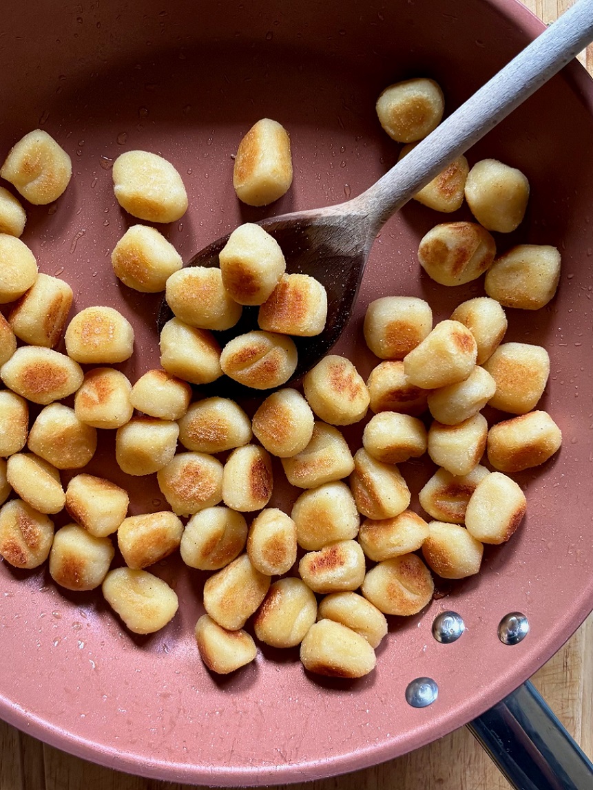 Ζεσταίνουμε καλά ένα αντικολλητικό τηγάνι και βάζουμε λίγο βούτυρο και λίγο ελαιόλαδο, σε ποσότητα που να καλύπτουν τον πάτο. Μόλις λιώσει το βούτυρο και αρχίσει να τσιτσιρίζει προσθέτουμε 200 γρ. φρέσκα νιόκι πατάτας (βλ. tips). Αλατοπιπερώνουμε και ψήνουμε σε δυνατή φωτιά, ανακατεύοντας συνεχώς με ξύλινη κουτάλα, μέχρι να ροδίσουν από όλες τις πλευρές. Τα αφαιρούμε από το τηγάνι και τα μεταφέρουμε σε μπολ.