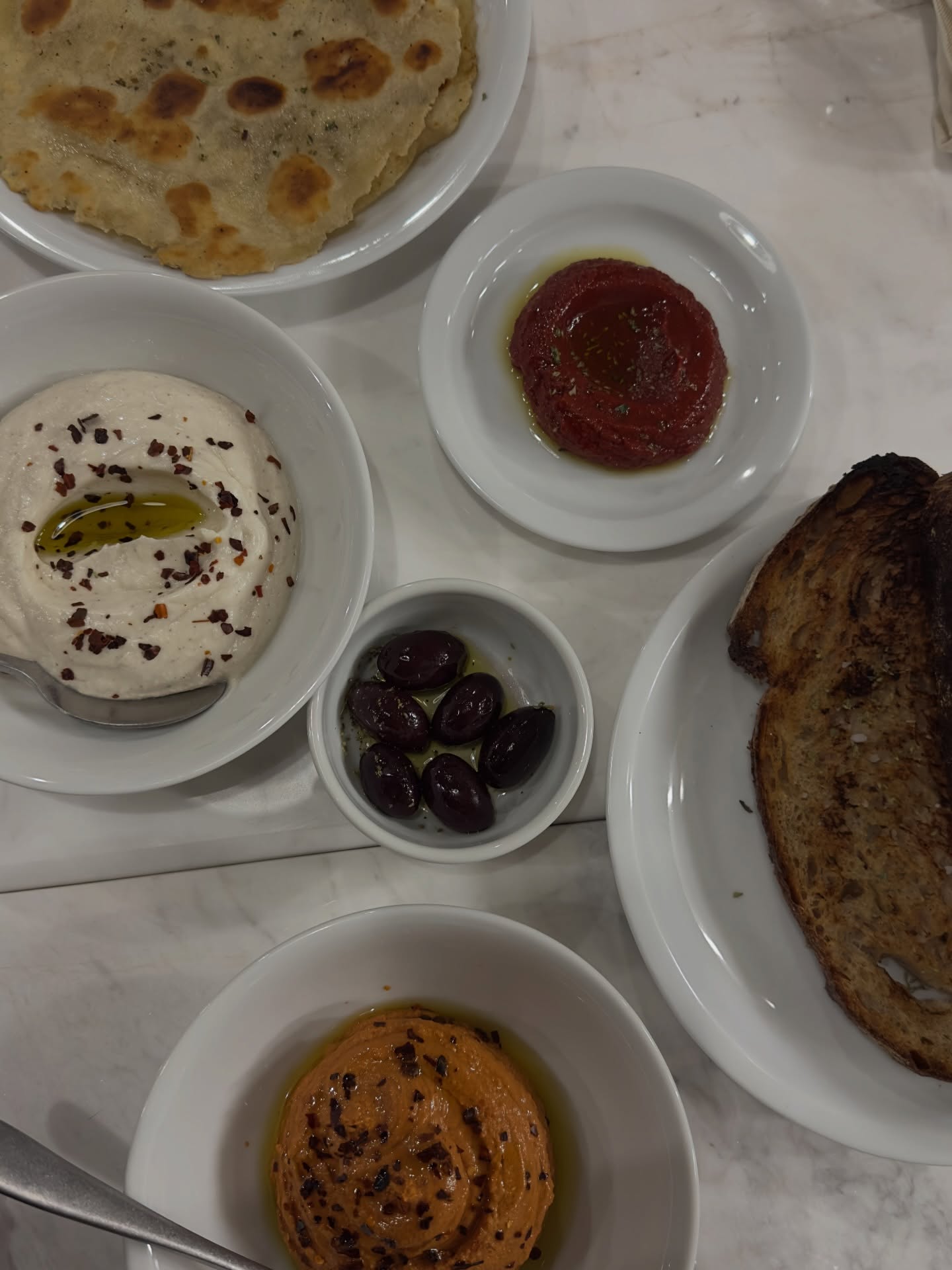 Συνεχίσαμε ακάθεκτοι δύο φανταστικοκαταπληκτικά «αλείμματα». Από τη μία ο ταραμάς με καπνιστό λάδι, γλυκό μπούκοβο και μια τραγανή πιτούλα ναν ήταν ένα αλοιφώδες όνειρο που ξύπνησε θαλασσινές μνήμες κι ας βρισκόμαστε στην καρδιά του χειμώνα. Από την άλλη η πάπρικα Θεσσαλονίκης (7,5€) με κατσικίσια φέτα, μετσοβόνε και πιτούλα ναν, ήταν μια κολασμένη εκδοχή τυροκαυτερής, έξτρα πικάντικη και πιπεράτη που έδρασε άκρως ερεθιστικά στον ουρανίσκο μας.