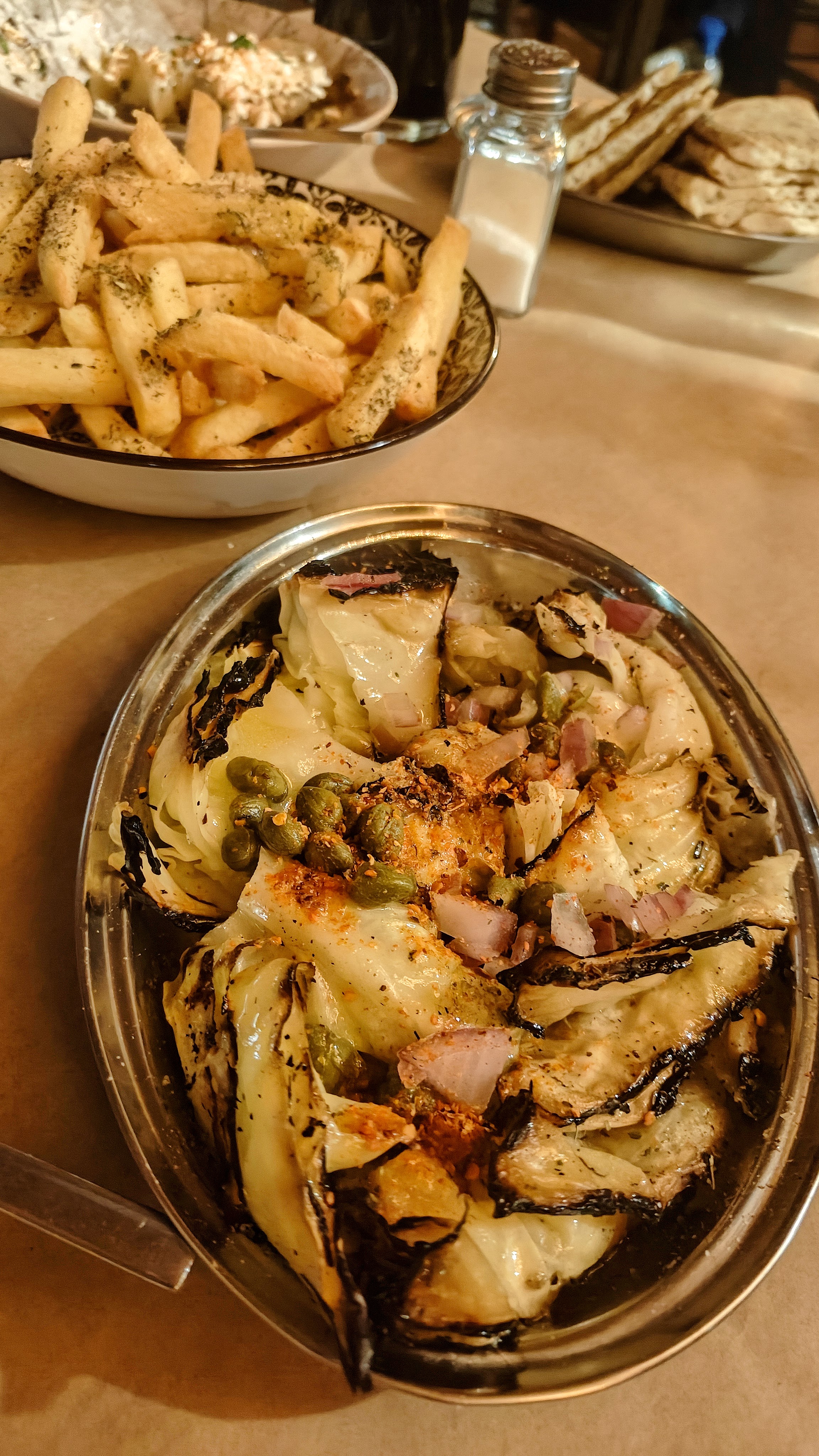 Παραγγείλαμε φρεσκοτηγανισμένες πατάτες (5€) σε ικανοποιητική μερίδα, τηγανισμένες σωστά με τραγανό κέλυφος, αλατισμένες τόσο όσο, με τη ρίγανή τους, και μαζί ήρθαν και οι κομμένες πιτούλες, επίσης νοστιμότατες, ως κουβέρ. Η ψητή πατάτα στη χόβολη (6€), σερβίρεται με λαδολέμονο, τριμμένη φέτα και φρέσκο κρεμμυδάκι, ενώ από τα πιάτα ημέρας μας πρότειναν και τιμήσαμε δεόντως το «καμμένο» λάχανο (5,5€), με κάππαρη και λαδολέμονο, το οποίο κάτι μας λέει ότι θα λάβει την θέση που του αξίζει στον μόνιμο κατάλογο.