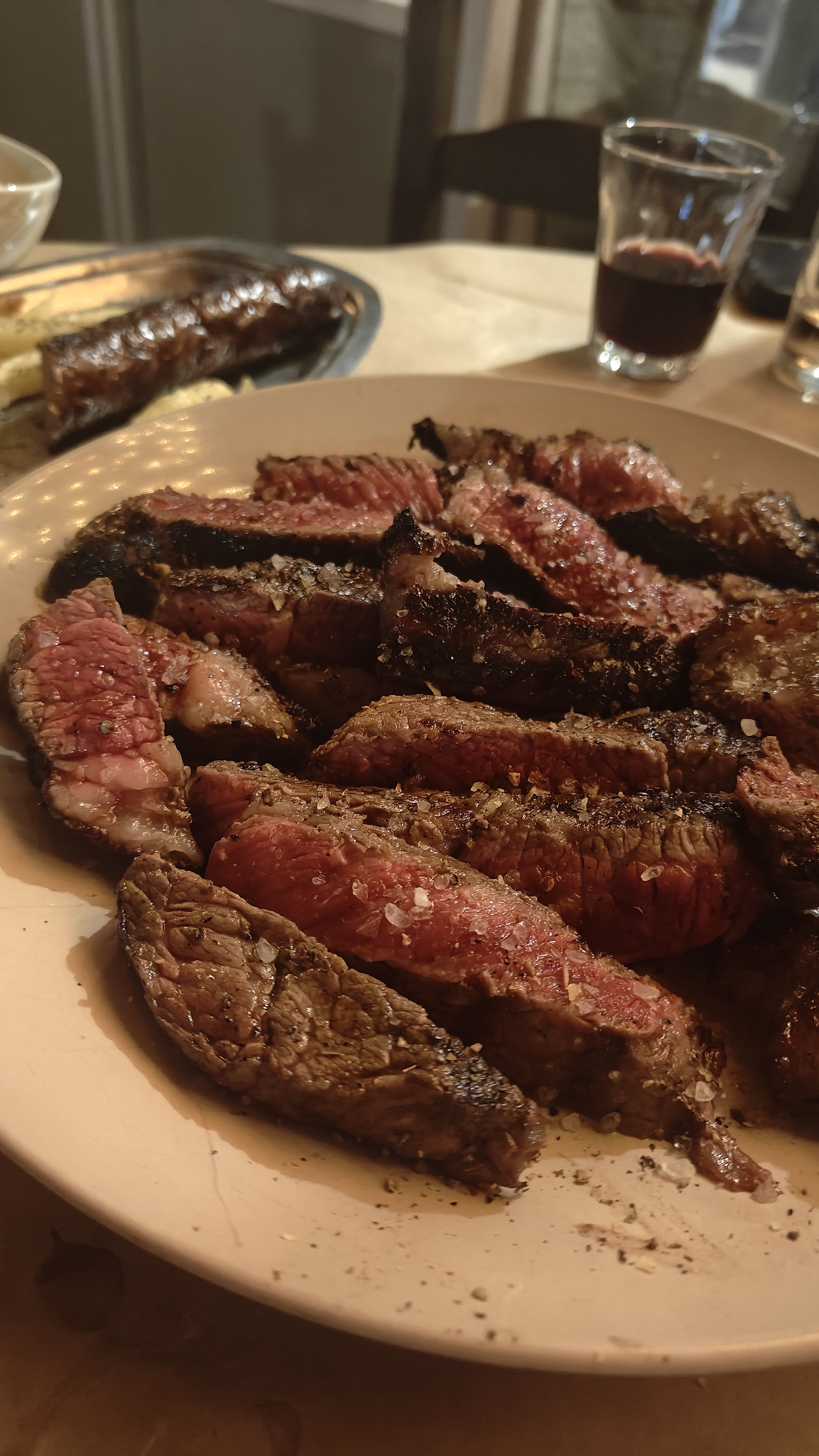 Ήρθε σε μερίδα 600 γραμμαρίων κατ’ ελάχιστο και ήταν ψημένο ακριβώς όπως το ζητήσαμε, και ακριβώς όπως πρέπει να απολαμβάνεται ένα τόσο εκλεκτό κρέας, medium rare. Έχει αρκετό ενδομυϊκό λίπος, το οποίο το κάνει να λιώνει στο στόμα, και φοβερή γεύση, η οποία αναδεικνύεται από το μαεστρικό ψήσιμο. Κάποια κομμάτια είχαν αρκετό λίπος, το οποίο σκλήραινε λίγο στο μάσημα, αλλά μικρό το κακό μπρος στη γοητεία ενός τέτοιου κρέατος.