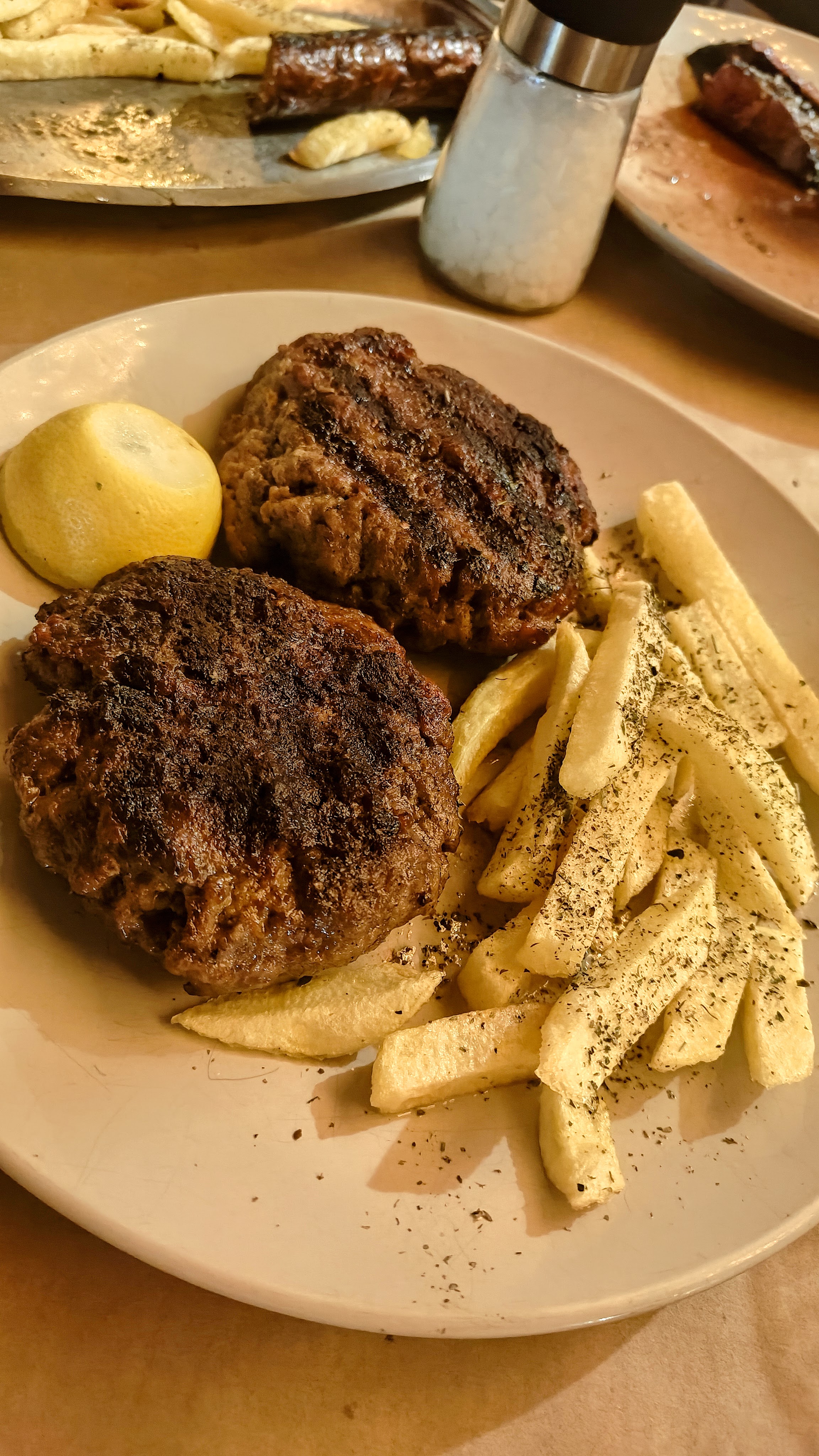 Νοστιμότατο, αν και όχι τόσο πικάντικο όσο θα θέλαμε, το πικάντικο λουκάνικο του καταλόγου έρχεται σε μερίδα που ξεχειλίζει από το πιάτο, με μερικές πατάτες τηγανιτές να το συντροφεύουν. Είναι νόστιμο και αρωματικό (9€). Φοβερά τα πρόβεια μπιφτέκια (12€), σε γενναιόδωρο μερίδα δύο τεμαχίων, με τον κιμά να είναι πλασμένος σωστά, χωρίς περιττά μπαχαρικά, να αναδεικνύει όλη τη νοστιμιά της πρώτης ύλης.