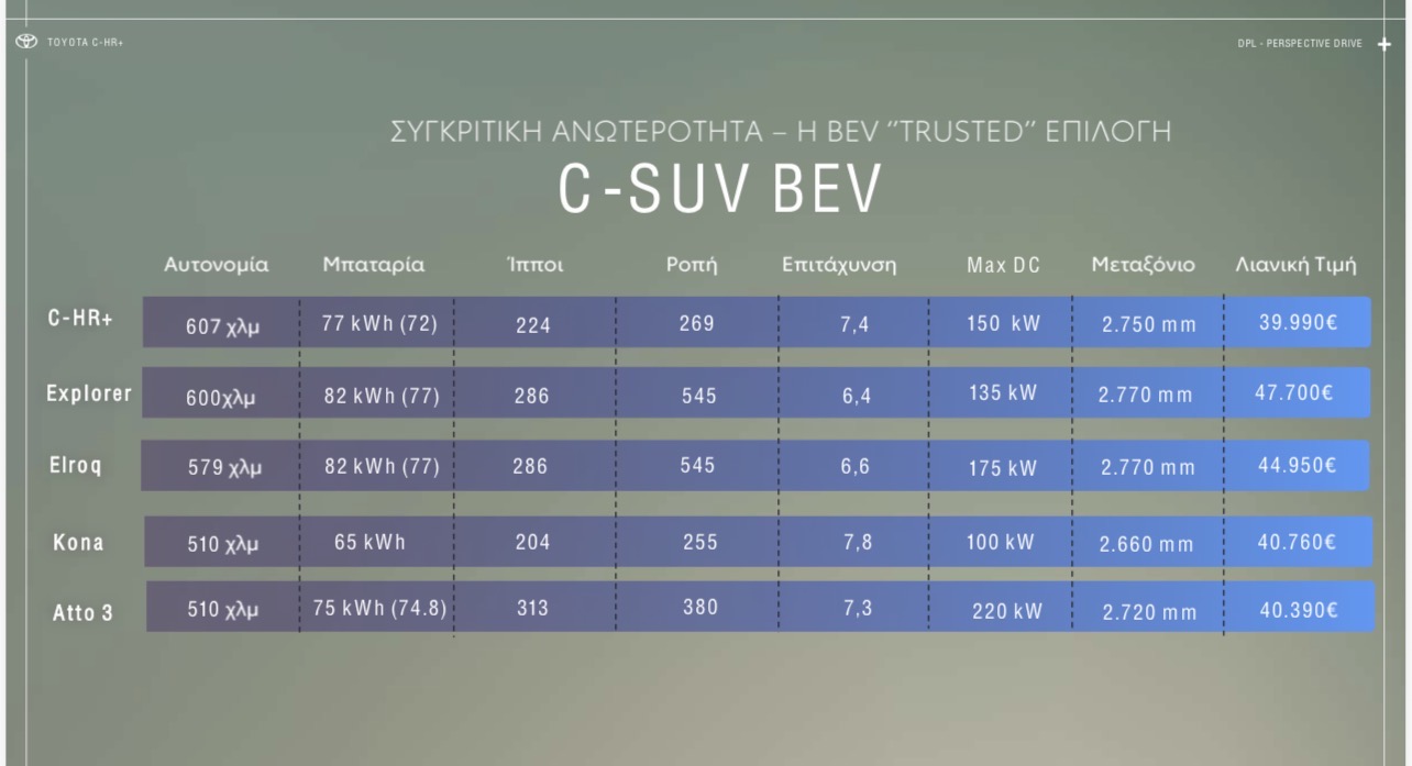Στον πίνακα φαίνονται οι διαφορές του Toyota C−HR+ με τα ανταγωνιστικά μοντέλα που κυκλοφορούν στην ελληνική αγορά.