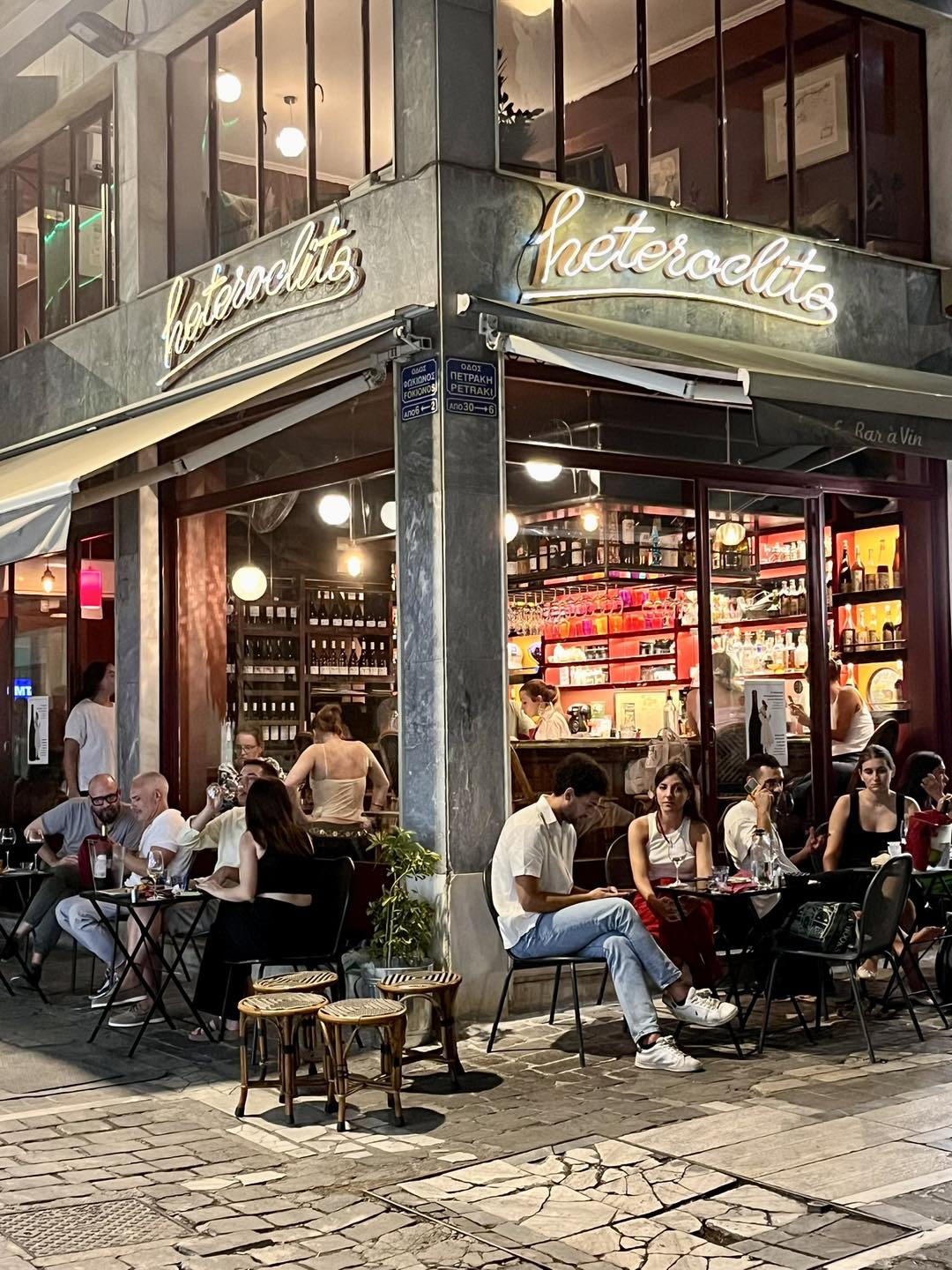 Ένα από τα πρώτα wine bar που μας έμαθαν να πίνουμε καλό ελληνικό κρασί σε ποτήρι, το Heteroclito έχει έναν αέρα που ταιριάζει γάντι στην Πετράκη. Με έμφαση στα βιολογικά και φυσικά κρασιά από όλη την Ελλάδα και μια πολύ ενημερωμένη λίστα που ανανεώνεται τακτικά, είναι το ιδανικό μέρος για ένα ποτήρι κρασί με συνοδεία εκλεκτών τυριών. Οι τιμές για το ποτήρι κρασί ξεκινούν από 6,50€. Δες το αναλυτικό μενού, που ανανεώνεται κάθε μήνα, εδώ.
