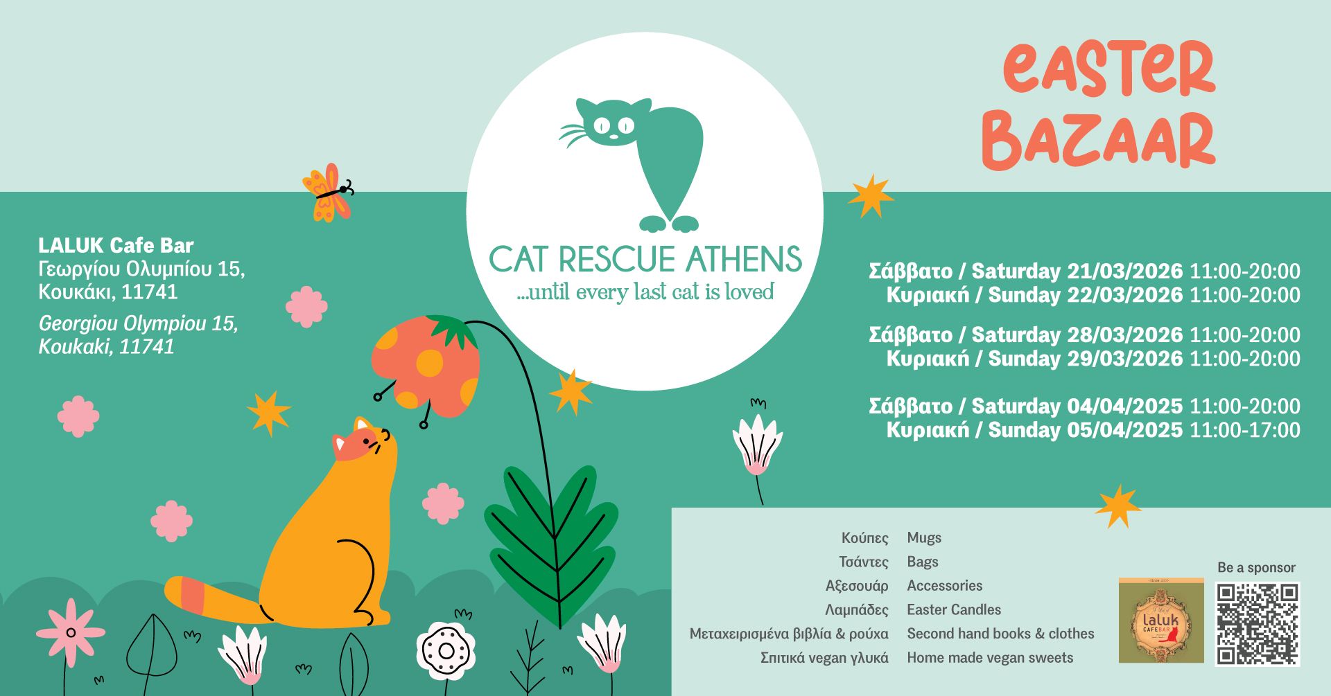 Το πασχαλινό bazaar της Cat Rescue Athens πραγματοποιείται 4 και 5 Απριλίου στον φιλόξενο χώρο του Laluk Cafe-Bar. Εκεί θα βρεις χειροποίητες δημιουργίες, δώρα και μικρά αντικείμενα από δημιουργούς που στηρίζουν το φιλοζωικό έργο της ομάδας. Κάθε αγορά συμβάλλει άμεσα στη σίτιση, τη φροντίδα και την περίθαλψη των γατών που φροντίζει η οργάνωση.
