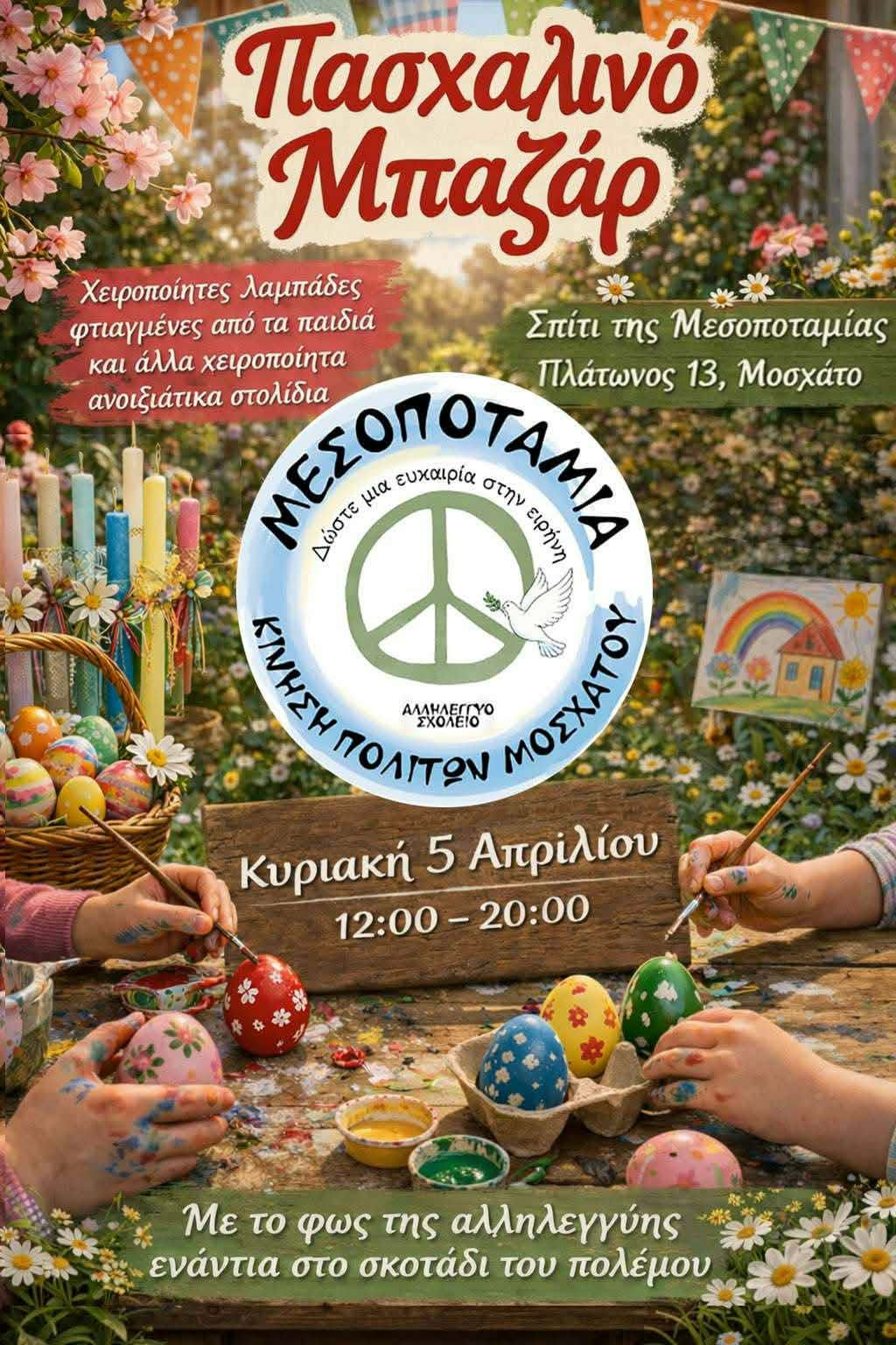 Το Αλληλέγγυο Σχολείο Μεσοποταμίας διοργανώνει το δικό του πασχαλινό bazaar στις 5 Απριλίου, δίνοντας έμφαση στη δημιουργία και το κοινωνικό μήνυμα. Στο πλαίσιο της δράσης, τα παιδιά συμμετέχουν σε εργαστήρι κατασκευής λαμπάδων, τις οποίες διακοσμούν με αντιπολεμικά μηνύματα αλληλεγγύης. Οι χειροποίητες αυτές δημιουργίες θα διατεθούν στο bazaar, συνδυάζοντας το πασχαλινό πνεύμα με την έκφραση και την ευαισθητοποίηση.