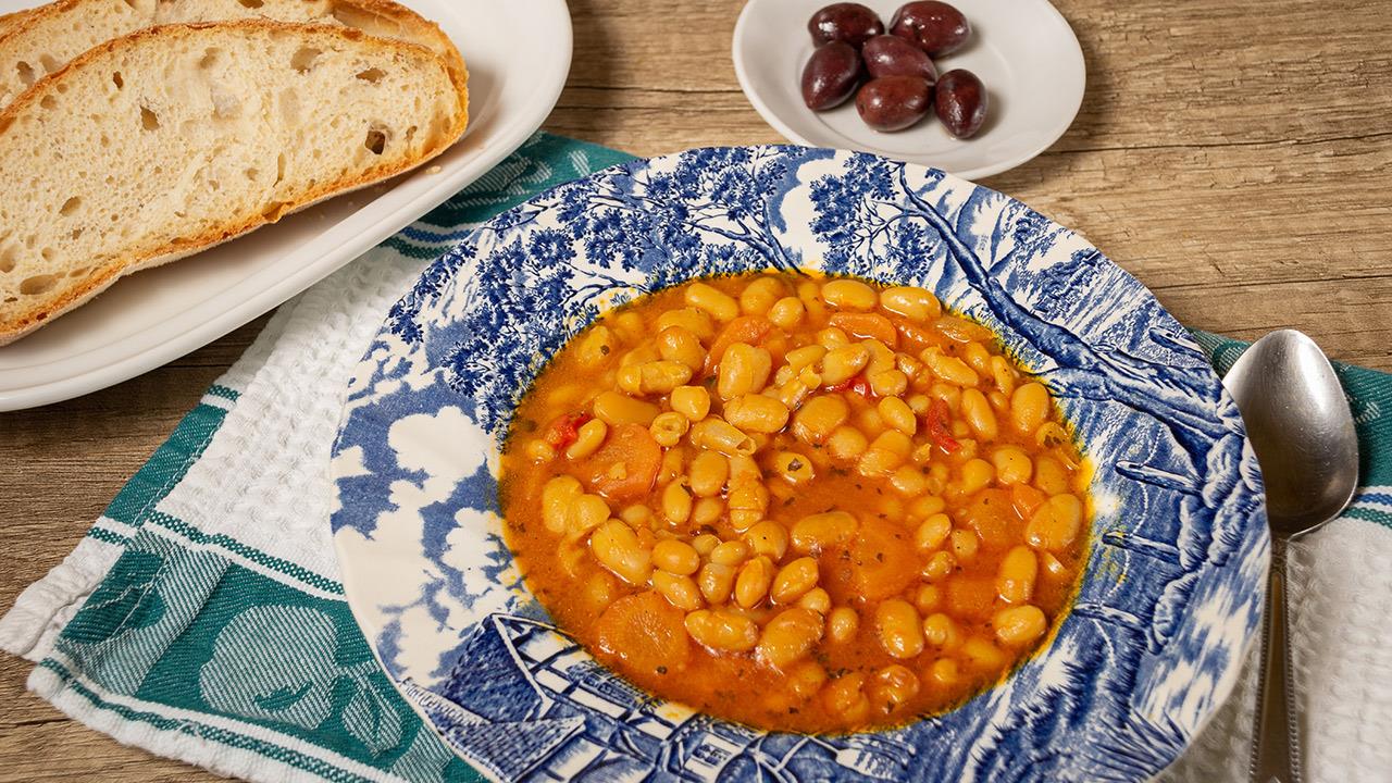 Υλικά: 500 γρ. φασόλια ξηρά λευκά, 2 ξερά κρεμμύδια, 3 καρότα, 1 μικρό πράσο, 1 μάτσο σέλινο, 1 κουταλάκι του γλυκού γλυκιά πάπρικα, 1 κόκκινη καυτερή πιπεριά (προαιρετικά), 1/2 κούπα ελαιόλαδο, 1 κουταλιά της σούπας πελτές ντομάτας, 2-3 ώριμες ντομάτες, λίγο αποξηραμένο θυμάρι, αλάτι, πιπέρι