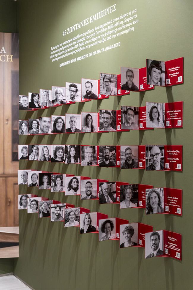 Από τις πιο ενδιαφέρουσες γωνιές της έκθεσης, εκείνη με τις φωτογραφίες και τα ονόματα 45 ερευνητών που πέρασαν από τη Γεννάδειο, από τους οποίους οι επιμελήτριες της έκθεσης, Μαρία Γεωργοπούλου και Ειρήνη Σολομωνίδη, ζήτησαν να επιλέξουν ο καθένας ένα αντικείμενο που είναι γι’ αυτούς η Γεννάδειος, και να μιλήσουν για αυτό μέσα σε 200 λέξεις. Σκανάροντας τα QR code κάτω από την φωτογραφία του καθενός, διαβάζεις αφηγήσεις προσωπικές, που συνδέουν έργα και ημέρες –ή, αν προτιμάς, έργα και ιστορίες ζωής.