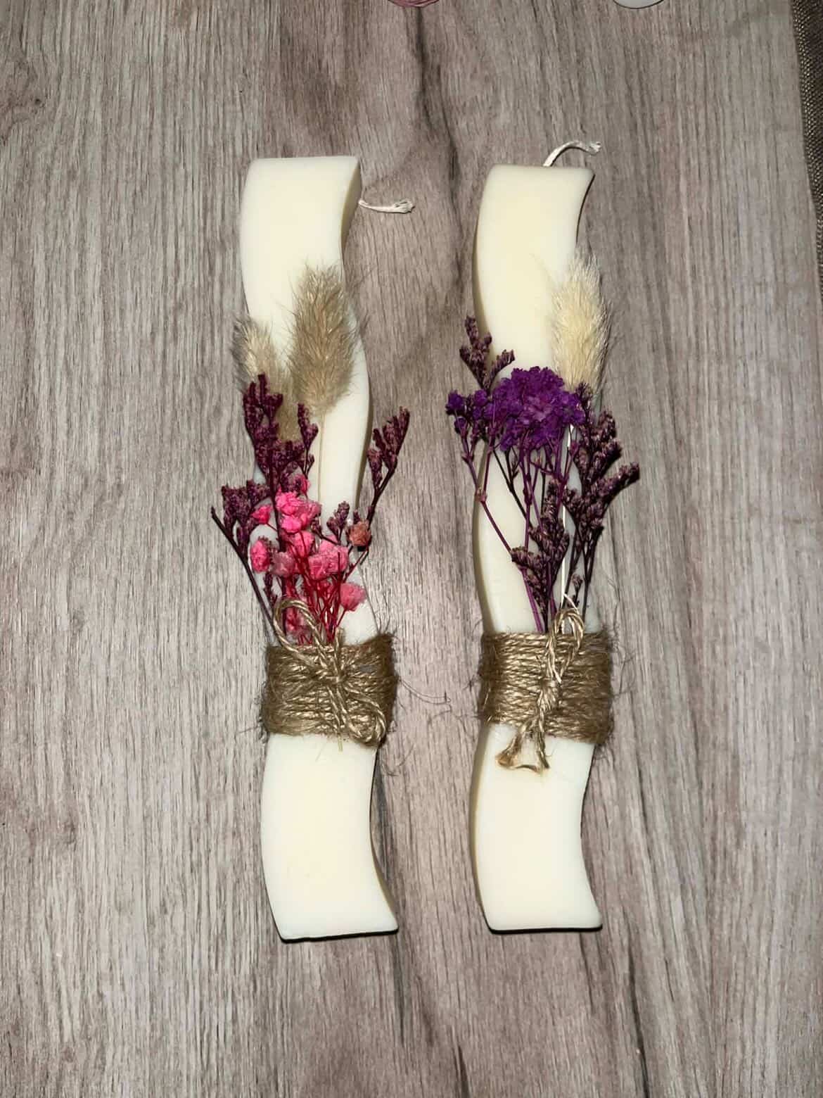 Λαμπάδα από κερί σόγιας από το kar.ma_creations, που μπορεί να διακοσμηθεί με στοιχεία όπως αποξηραμένα λουλούδια, φυσικά υλικά και χειροποίητες λεπτομέρειες. Τιμή στα 12€.
