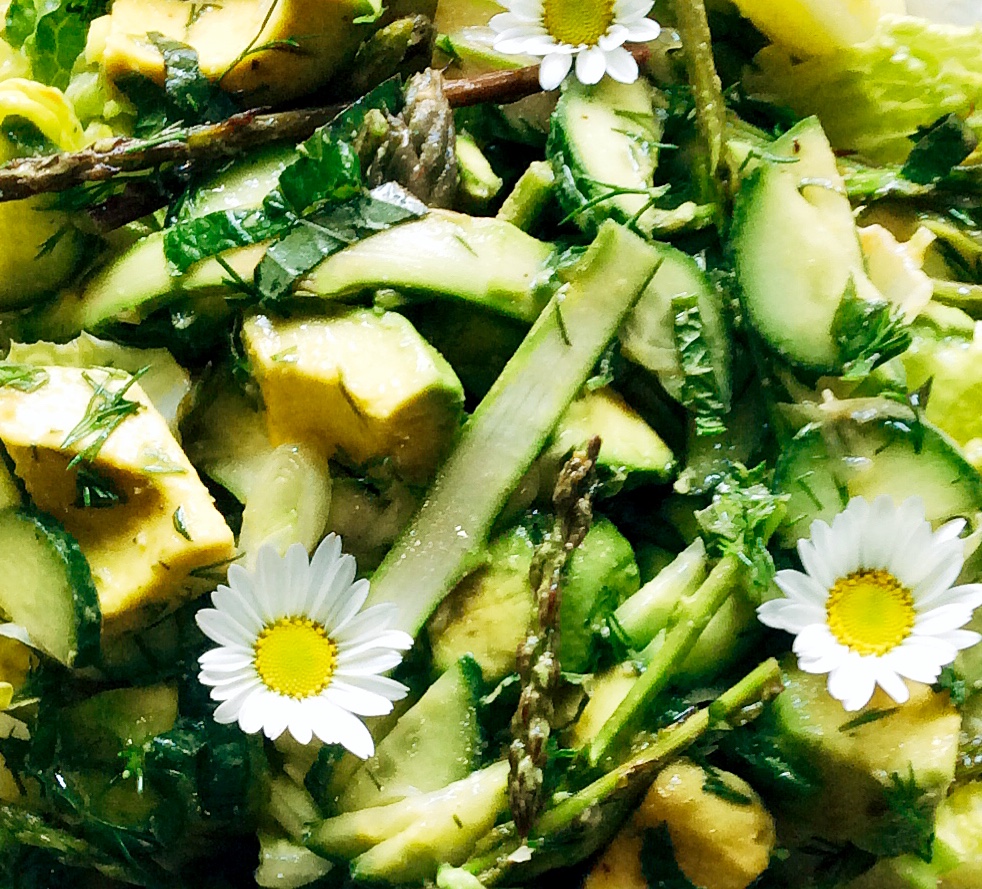 Πλένουμε, στραγγίζουμε και σκουπίζουμε καλά τα σαλατικά και τα μυρωδικά: 1 μαρούλι, 1 γαλλική σαλάτα, 1 μάτσο κοινά πράσινα σπαράγγια, 1 μάτσο άγρια σπαράγγια, 2 μικρά φρέσκα κρεμμυδάκια, 1 μικρό αγγούρι, άνηθο, βασιλικό και δυόσμο. Χοντροκόβουμε το μαρούλι και τη σαλάτα και κρατάμε τις καρδιές ολόκληρες. Αφαιρούμε τα κοτσάνια από τα σπαράγγια και των δύο ειδών: λυγίζοντάς τα, βλέπουμε πού σπάνε από μόνα τους. Κόβουμε και κρατάμε τις κορυφές από τα κοινά πράσινα, με τον αποφλοιωτή καθαρίζουμε το σκληρό εξωτερικό μέρος του κορμού τους και κατόπιν, πάντα με τον αποφλοιωτή, κόβουμε τον κορμό σε λωρίδες. Κρατάμε ολόκληρα τα άγρια σπαράγγια. Κόβουμε τα φρέσκα κρεμμυδάκια σε πολύ λεπτές φέτες. Κόβουμε το αγγούρι πρώτα κατά μήκος και κατόπιν τα δύο μισά σε πολύ λεπτές φέτες. Ψιλοκόβουμε τα μυρωδικά. Ετοιμάζουμε τη vinaigrette χτυπώντας σε ένα μικρό βαζάκι λίγη μουστάρδα της αρεσκείας μας, χυμό λεμονιού, ξίδι από λευκό κρασί, εξαιρετικό παρθένο ελαιόλαδο και αλατοπίπερο. Τελευταίο καθαρίζουμε και κόβουμε ένα ώριμο avocado και το περνάμε με μία κούπα λεμονιού για να μην μαυρίσει. Το προσθέτουμε στα σαλατικά και ανακατεύουμε τη σαλάτα με τη vinaigrette. Σερβίρουμε αμέσως.