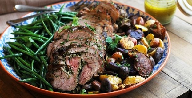 Ζητάμε από τον κρεοπώλη μας να ξεκοκκαλίσει ένα τροφαντό αρνίσιο ή κατσικίσιο μπούτι και να το ανοίξει με τέτοιο τρόπο, ώστε να τυλίγεται σε ρολό. Το ανοίγουμε στον πάγκο της κουζίνας και το αλατοπιπερώνουμε γενναιόδωρα κι από τις δύο πλευρές. Πολτοποιούμε στο multi από 1 ματσάκι φρέσκα αρωματικά βότανα της αρεσκείας μας 2-3 ειδών συν 1 ματσάκι μαϊντανό (βλ. tips), 2-3 σκ. σκόρδο, 2 κ.σ. εξαιρετικό παρθένο ελαιόλαδο και το ξύσμα από 1 μεγάλο λεμόνι. Αλείφουμε πρώτα την εσωτερική επιφάνεια του κρέατος, το τυλίγουμε σε σφιχτό ρολό, το δένουμε με σπάγκο και τέλος αλείφουμε και το εξωτερικό. Τοποθετούμε το κρέας στη λαμαρίνα του φούρνου που έχουμε στρώσει με λαδόκολλα και το περιτριγυρίζουμε με ποικιλία λαχανικών της αρεσκείας μας: πατάτες, καρότα, φασολάκια, μοσχομπίζελα, φινόκιο, ραπανάκια. Αλατοπιπερώνουμε τα λαχανικά και τα περιχύνουμε με λίγο ελαιόλαδο και ½ ποτήρι νερό. Σκεπάζουμε σφιχτά το ταψί με λαδόκολλα και αλουμινόχαρτο. Ψήνουμε σε προθερμασμένο φούρνο στη λειτουργία του αέρα, αρχικά στους 200ο C για 30΄. Κατεβάζουμε τη θερμοκρασία στους 180ο C και ψήνουμε για 60΄- 90΄ ακόμη, ανάλογα με το βάρος του κρέατος (βλ. tips). Τέλος ροδίζουμε για λίγο αφού το ξεσκεπάσουμε, περιχύνοντας το κρέας και τα λαχανικά ανά πεντάλεπτο με τους χυμούς. Ακουμπάμε το κρέας στο ξύλο κοπής και το αφήνουμε για 30΄ τουλάχιστον πριν να το κόψουμε σε φέτες, αφού αφαιρέσουμε τους σπάγκους. Σερβίρουμε με τα λαχανικά και τη σάλτσα.