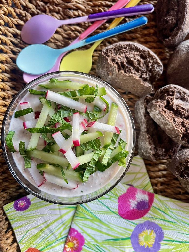 Μεταφέρουμε σε μπολ ή ποτήρια και γαρνίρουμε με ραπανάκια και αγγούρι που έχουμε κόψει σε πολύ λεπτά μπαστουνάκια σαν σπίρτα και λίγο ακόμη ψιλοκομμένο δυόσμο. Συνοδεύουμε με παξιμάδια, κριτσίνια ή ψημένο ψωμί.