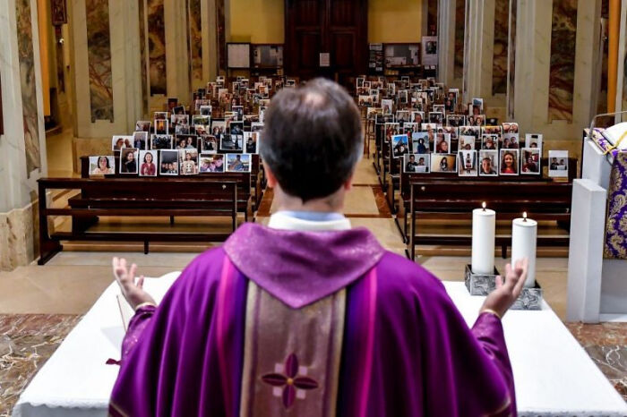 Σε μια εκκλησία στη Λομβαρδία της Ιταλίας, ένας ιερέας δεν άντεχε να λειτουργεί μπροστά σε άδεια στασίδια. Έτσι, ζήτησε από τους πιστούς να του στείλουν selfies και τις τοποθέτησε στα καθίσματα.