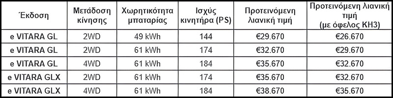 Το e Vitara διατίθεται με μπαταρίες 49 kWh και 61 kWh, σε εκδόσεις 2WD και 4WD, προσφέροντας αυτονομία έως 426 χλμ. (WLTP). Η επιτάχυνση είναι άμεση και ομαλή, ενώ το σύστημα θερμικής διαχείρισης, σε συνδυασμό με την αντλία θερμότητας, συμβάλλει στη βέλτιστη απόδοση της μπαταρίας και του κλιματισμού.