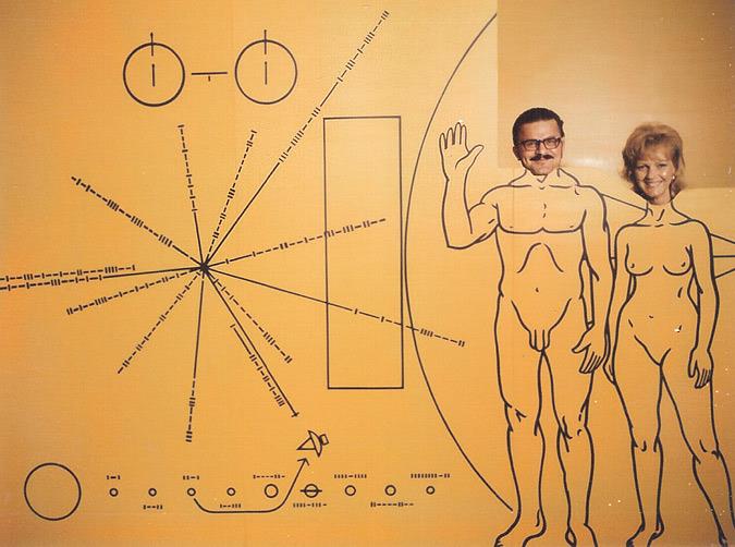 Ο Carl, μαζί με δυο άλλους συναδέλφους του επινόησαν μια έξυπνη αναμνηστική πλάκα που να εξηγεί την ανθρώπινη προέλευσή μας φέρνοντας ένα μήνυμα από τη Γη, αν κάποτε αυτό το διαστημόπλοιο θα έφτανε σε κάποιον πιο αναπτυσσόμενο πολιτισμό στο μακρινό μέλλον. Λίγο αργότερα σε μια επίσκεψή μου στο TRW είχα την ευκαιρία να φωτογραφισθώ με μια φίλη μου στην πλάκα του Carl Sagan αντιπροσωπεύοντας έτσι τον άντρα και τη γυναίκα του πλανήτη μας (βλ. συνημμένη εικόνα).