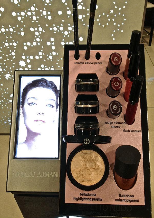 ένας ύμνος στο nude look -“Effetto Nudo”, με star products που κλέβουν τις εντυπώσεις, το ιριδίζον highlighter The Belladonna Palette και τα διάφανα κραγιόν Rouge d’Armani sheer, σε τρεις ρομαντικές δαμασκηνί αποχρώσεις που εμπνέονται από το glamour του Hollywood της δεκαετίας του ’30, ενώ το μακιγιάζ ολοκληρώνεται με μολύβια ματιών, γκλος και το μοναδικό fluid sheer.