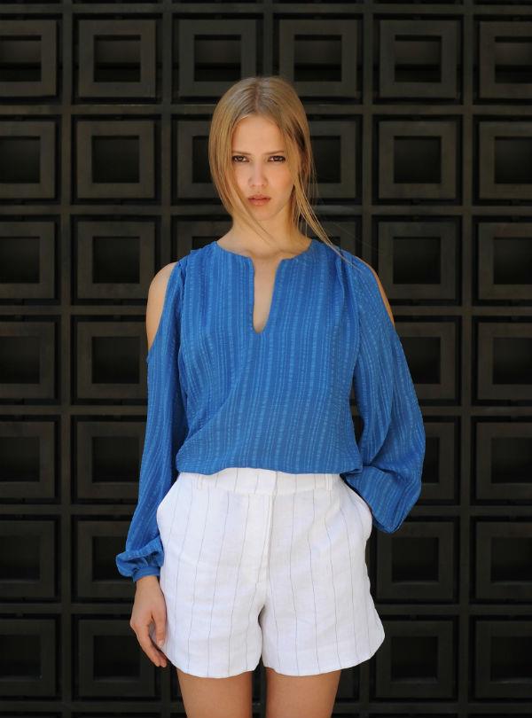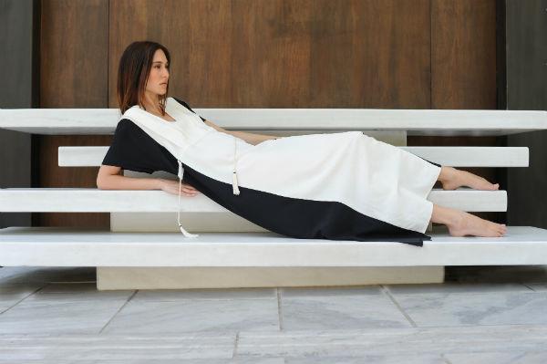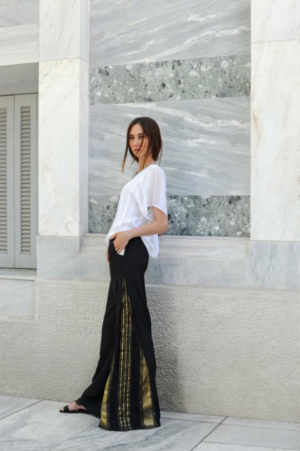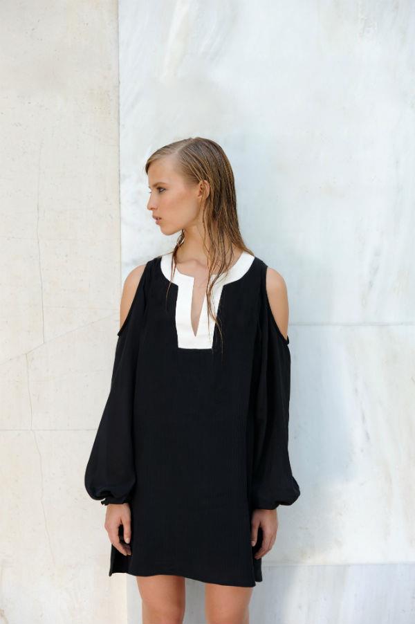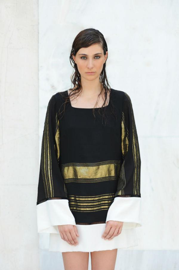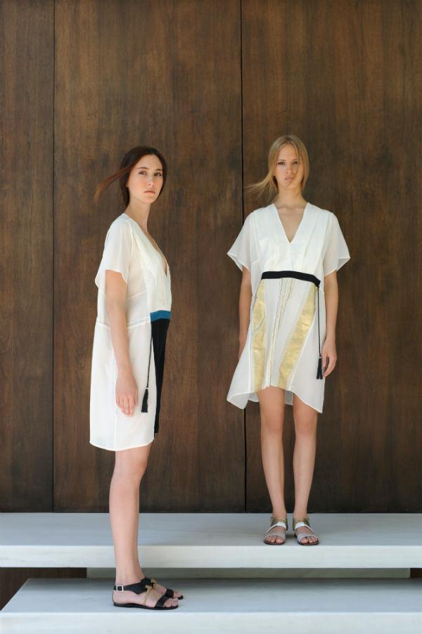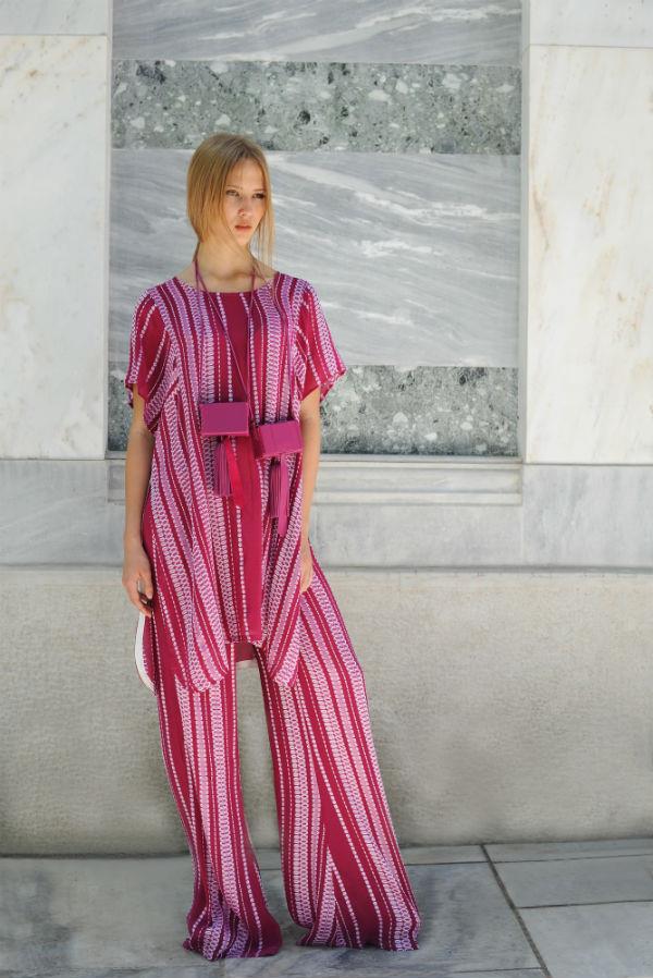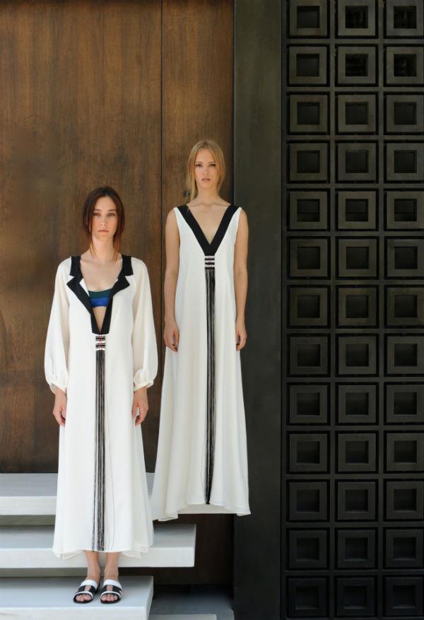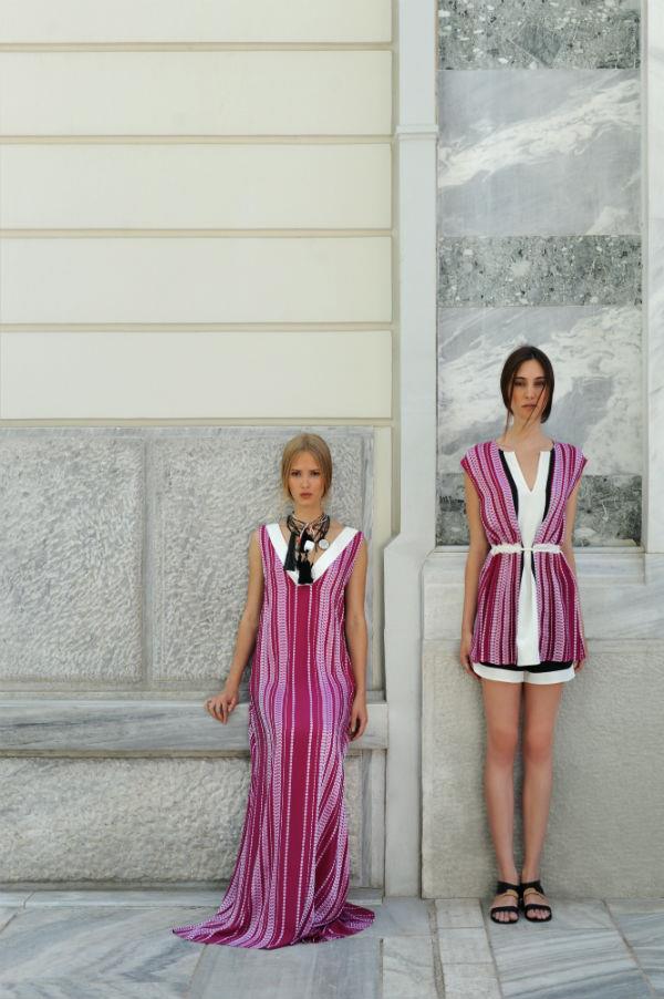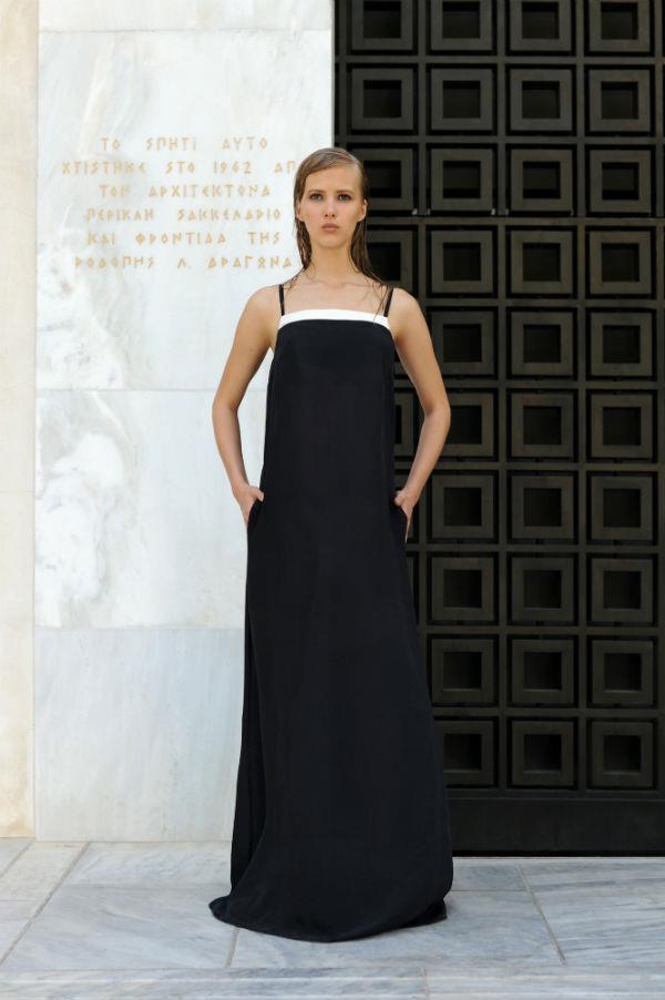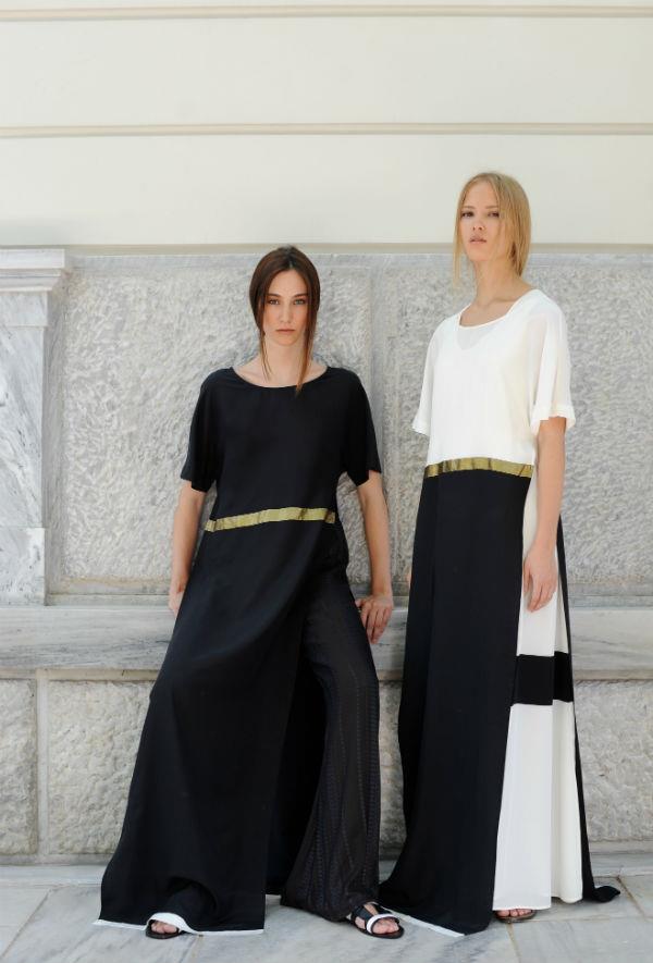 Αυστηρά γεωμετρικά σχήματα και φόρμες συνυπάρχουν με φυσικά υλικά όπως το μετάξι, το λινό και το βαμβάκι. Οι χρωματικές αντιθέσεις, το μαύρο και το άσπρο, σε συνδυασμό με μικρές εκρήξεις φωτός σε χρυσό, φούξια και τιρκουάζ, αναδύουν την ουσία του μεσογειακού καλοκαιριού.