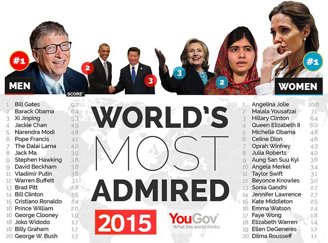 Κατ’ αρχήν, ας ξεκινήσουμε λέγοντας ότι ο άνδρας που θαυμάζει περισσότερο ο πλανήτης είναι ο Bill Gates. Η δε παγκοσμίως πιο αξιοθαύμαστη γυναίκα είναι η Angelina Jolie. Στις δεύτερες θέσεις συναντάμε αντίστοιχα τον Μπάρακ Ομπάμα και τη Μαλάλα Γιουσαφζάι.