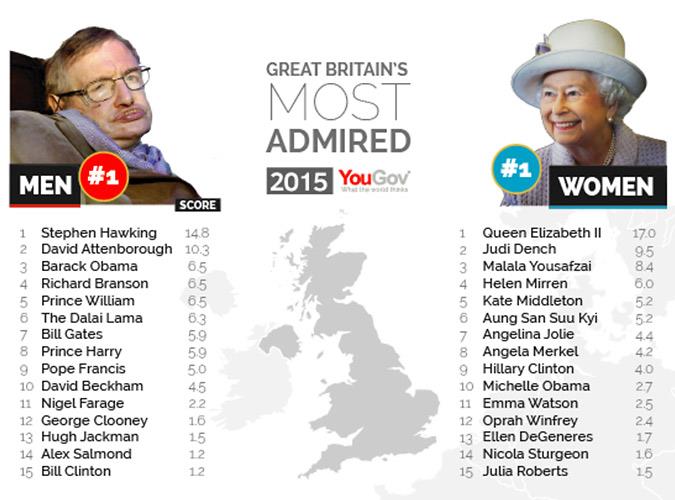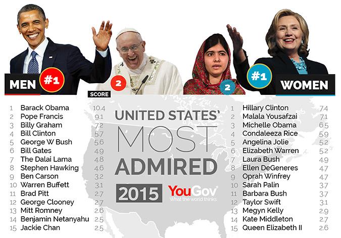 Το βρετανικό YouGov έκανε σε 25.000 ανθρώπους σε 23 χώρες την εξής απλή ερώτηση: «Από τους εν ζωή ανθρώπους σε όλο τον πλανήτη, ποιον θαυμάζετε περισσότερο;». Τα αποτελέσματα, που συγκεντρώθηκαν σε δύο top-10 ανδρών και γυναικών, ενδέχεται να σας εκπλήξουν.