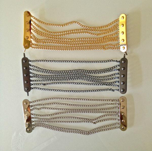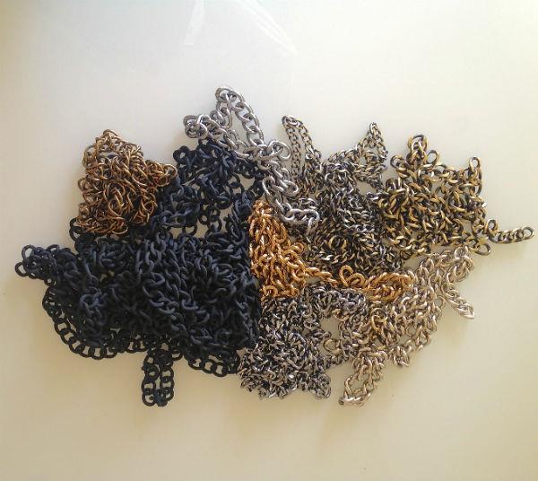 Ακολουθεί η επιλογή εξαρτημάτων για την κατασκευή της κάθε τσάντας. Αλυσίδες, μοτίφ, δερμάτινα χερούλια. Τα πιο πολλά μοτίφ προέρχονται από κοσμήματα, ενώ μεγάλη σημασία δίνεται και στην ποιότητα των αλυσίδων που θα χρησιμοποιηθούν.