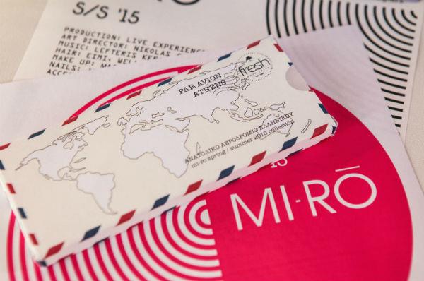 Ο Δημήτρης Μαστρόκαλος και ο Γιάννης Ράπτης, το ταλαντούχο δίδυμο πίσω από τους ΜI-RO, σχεδίασαν το ταξίδι S/S 15, τόσο για γυναίκες, όσο και για άντρες. Οι υπέροχες δημιουργίες της Συλλογής, με έντονες επιρροές από τα 60s, αναβίωσαν και αποτύπωσαν τη χρυσή εποχή της Αεροπορίας του 1967 "προσγειώνοντας" την στο διεθνές jet set του σήμερα.