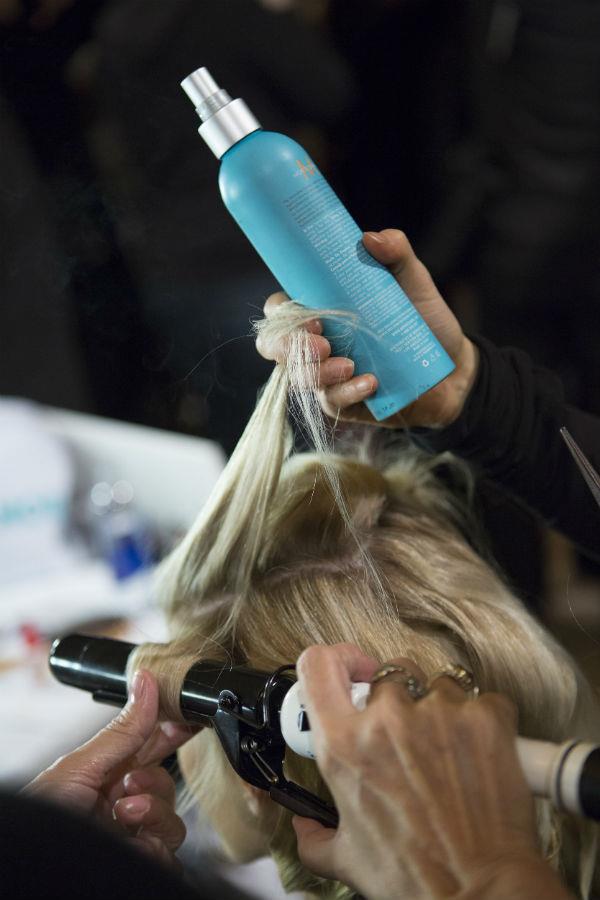 Στη συνέχεια, ψεκάστε ένα κεντρικό τμήμα με το Moroccanoil Luminous Hairspray. Σε ένα πλατύ σίδερο για μπούκλες, στριφογυρίστε τα μαλλιά από την κορυφή έως τη μέση τους και αφήστε το κάτω τμήμα ίσιο.