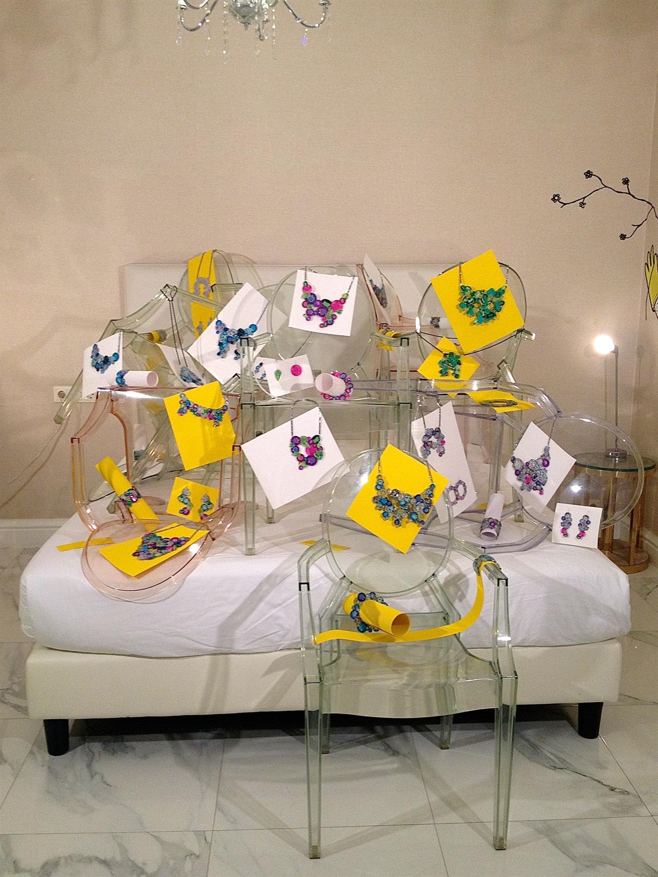 Στη δημιουργική διαδικασία της συλλογής, ξεκίνησε φτιάχνοντας χάρτινα κολάζ από φωτογραφίες διαμαντιών, τα οποία στη συνέχεια εκτυπώθηκαν ψηφιακά σε πλέξιγκλας, κόπηκαν με laser και πήραν σχήμα σε καλούπι. Όλα τα μεταλικά στοιχεία είναι από ασήμι 925, οι χάντρες είναι επιμεταλλωμένοι αιματήτεs και η υψηλών προδιαγραφών κατασκευή, έγινε σε ένα υπερσύγχρονο ελληνικό εργοστάσιο. Το τελικό αποτέλεσμα δίνει την εντύπωση ότι βλέπει κανείς ένα εντυπωσιακό και πολύτιμο κόσμημα, αλλά είναι απλά μια ψευδαίσθηση! Στην έκθεση “Maison & Objet” στο Παρίσι, αναγνωρίστηκε η μοναδική πρωτοτυπία της ιδέας, το χιούμορ, η άψογη ποιότητα και η σημασία στην λεπτομέρεια, έγιναν πωλήσεις σε galleries και concept stores, βρέθηκε αντιπρόσωπος για την Ιαπωνία και η Δάφνη Βαλέντε έγινε δεκτή στην έκθεση αξεσουάρ μόδας “Premiere Classe” στο Παρίσι την επόμενη σεζόν.