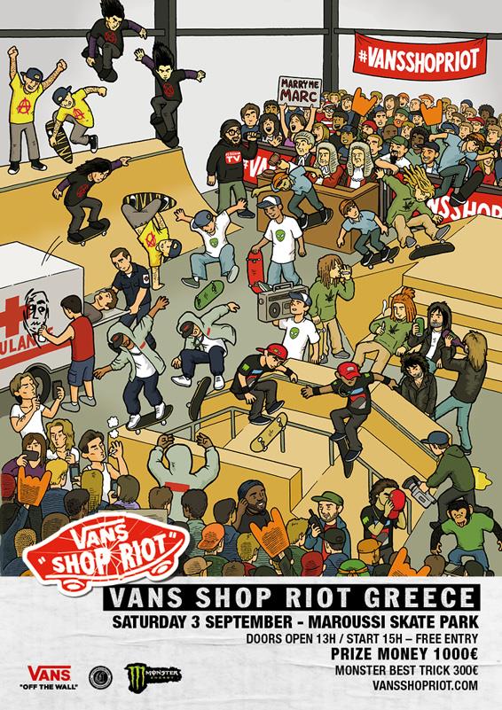 Το ελληνικό Vans Shop Riot θα πραγματοποιηθεί το Σάββατο 3 Σεπτεμβρίου, στις 15:00 στο Μαρούσι Skate Park (Αμαρυσίας Αρτέμιδος & Γ. Πιτταρά). Όλοι οι λάτρεις της street και skate κουλτούρας θα απολαύσουν για ακόμη μια φορά ένα απόγευμα γεμάτο ενέργεια, μουσική και skate υψηλού επιπέδου.