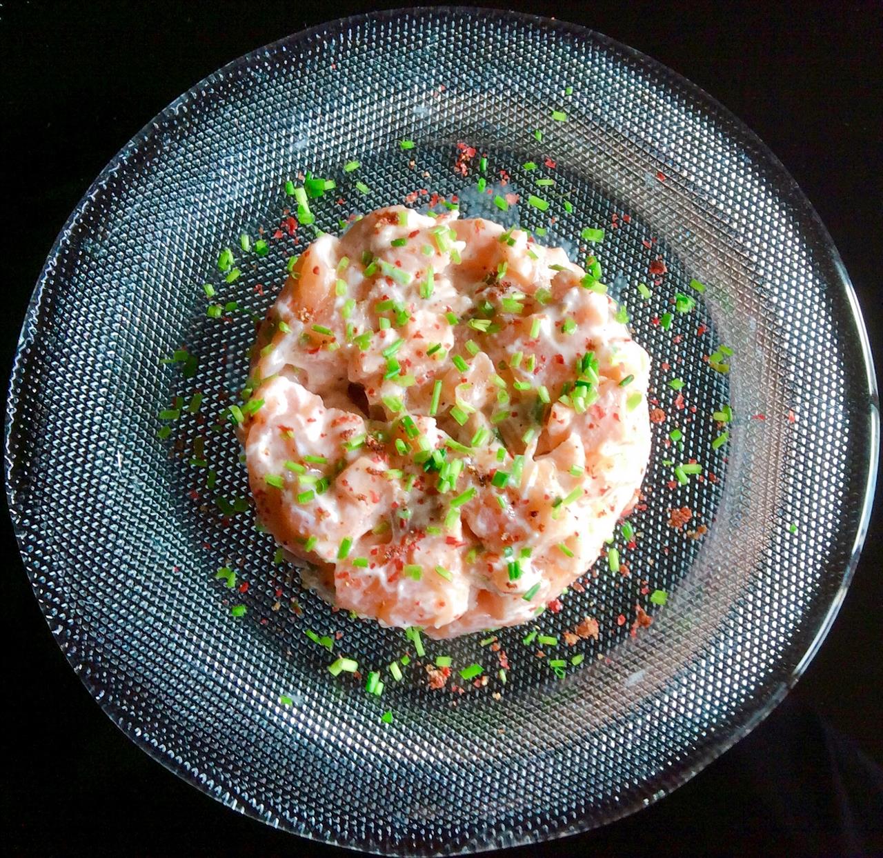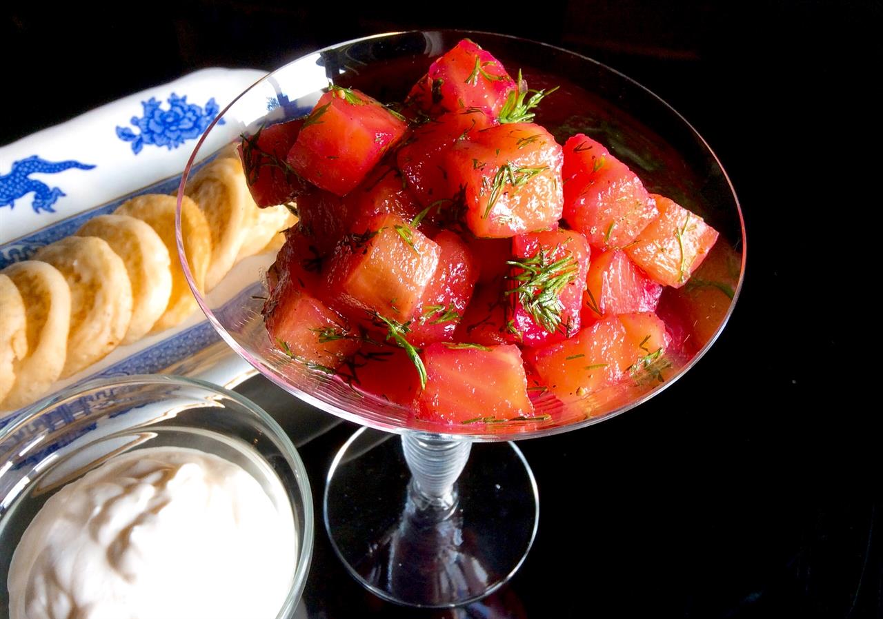 Για 4 άτομα. Κόβουμε σε κύβους διαστάσεων περίπου 1 x 1 εκ. δύο φιλέτα σολομού χωρίς δέρμα, βάρους περίπου 200 γρ. το καθένα. Σε ένα γυάλινο μπολ ανακατεύουμε 4 κοφτές κ.σ. ζάχαρη, 2 κ.γλ. αλάτι, μπόλικο μαύρο πιπέρι και ½ ματσάκι ψιλοκομμένο άνηθο. Προσθέτουμε τους κύβους του ψαριού και 1 ωμό παντζάρι κομμένο σε κύβους. Ανακατεύουμε καλά και βάζουμε στο ψυγείο για 1 ώρα. Αφαιρούμε το παντζάρι, σουρώνουμε για να απομακρύνουμε τα υγρά που θα έχουν αφήσει τα υλικά και μοιράζουμε τον σολομό σε 4 ποτήρια. Συνοδεύουμε με ξινή κρέμα και ζεστά μπλινί.