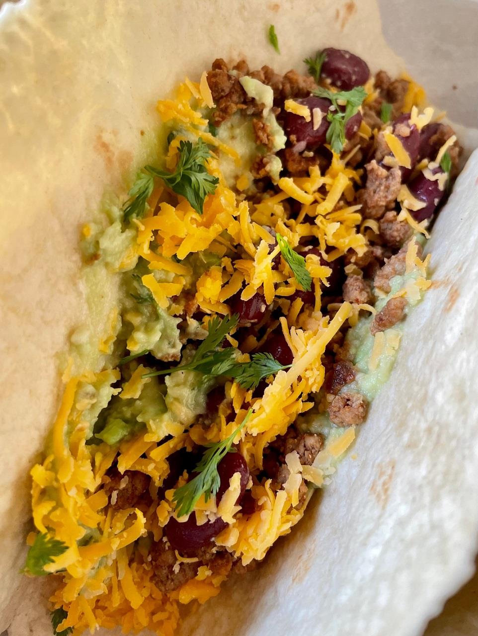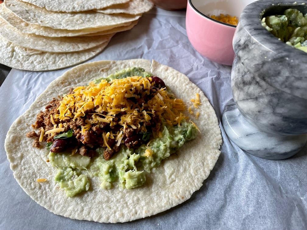 Κιμάς : Guacamole, κιμάς, φασόλια, φρέσκος ψιλοκομμένος κόλιανδρος και τριμμένο cheddar.