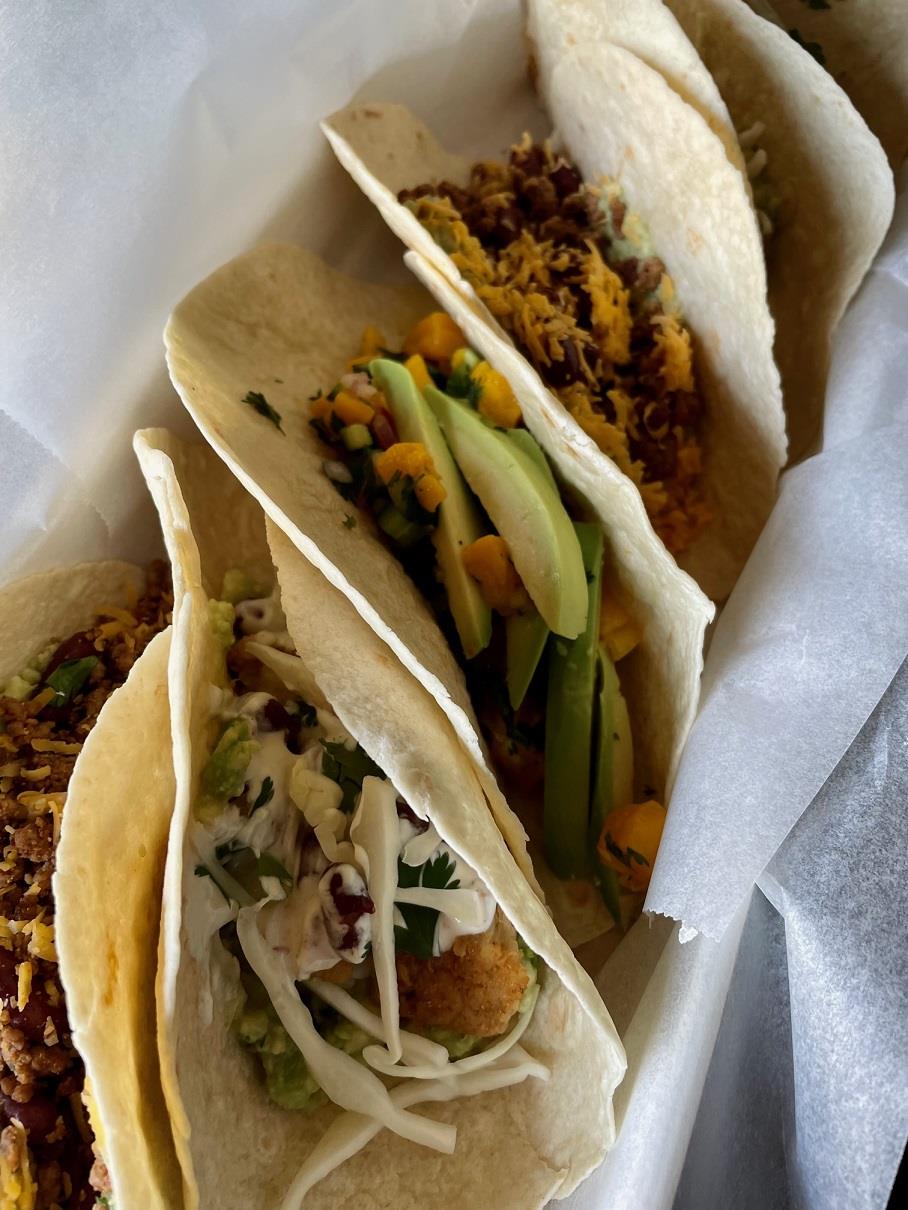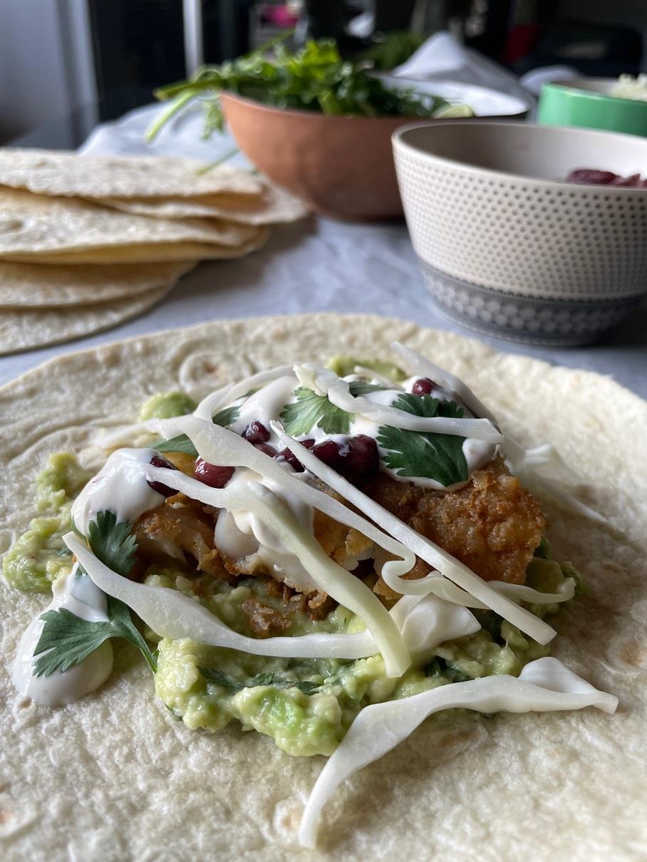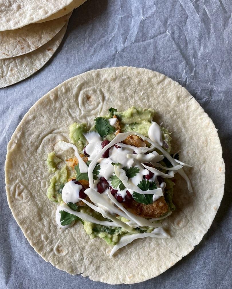 Μπακαλιάρος : Guacamole, ψάρι, φασόλια, φρέσκος ψιλοκομμένος κόλιανδρος, ψιλοκομμένο λάχανο, καυτερή μαγιονέζα.