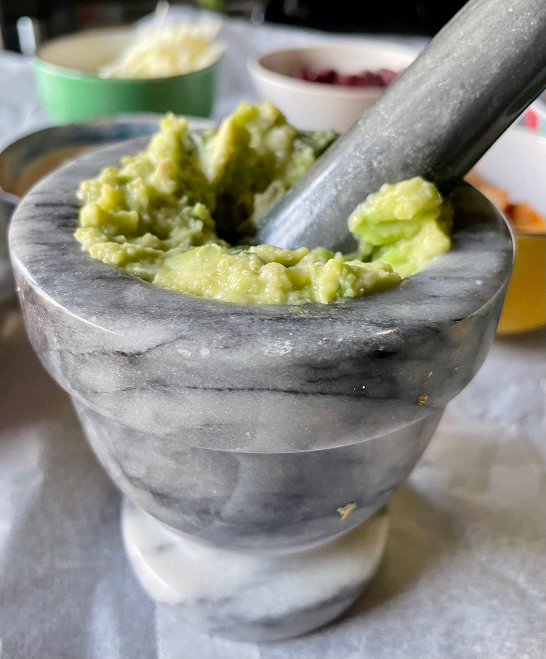 Το παν σε ένα πετυχημένο guacamole είναι το avocado. Πρέπει να είναι υπερώριμο αλλά όχι μαυρισμένο. Από εκεί και πέρα χτίζουμε σταδιακά τη γεύση όπως μας αρέσει, χωρίς όμως να το κάνουμε πολύ καυτερό γιατί πρέπει να λάβουμε υπόψη ότι και τα υπόλοιπα υλικά των tacos είναι αρκετά καυτερά. Αν, όμως, προορίζουμε το guacamole σαν dip για συνοδεία tortilla chips, μπορούμε να το κάνουμε όσο καυτερό μας αρέσει. Το δεύτερο πιο σημαντικό στοιχείο, όπως έγραψα πιο πάνω, είναι ότι το guacamole δεν είναι αλοιφή, γι’ αυτό το φτιάχνουμε ιδανικά στο γουδί, ή, εάν δεν έχουμε, λιώνουμε το avocado με πιρούνι. Με ένα avocado έχουμε αρκετή ποσότητα για 6 tacos.