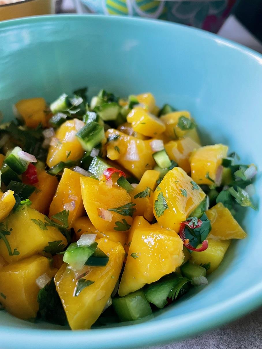 Κόβουμε σε κύβους 1 ώριμο mango και 1 μικρό αγγούρι και τα βάζουμε σε μπολ. Προσθέτουμε ¼ ξερού κρεμμυδιού πολύ πολύ ψιλοκομμένο, φρέσκο ψιλοκομμένο κόλιανδρο, 1-2 φρέσκιες πιπερίτσες chili (με ή χωρίς τα σπόρια αναλόγως του πόσο μας αρέσουν τα καυτερά), χυμό lime και αλάτι. Ανακατεύουμε καλά.