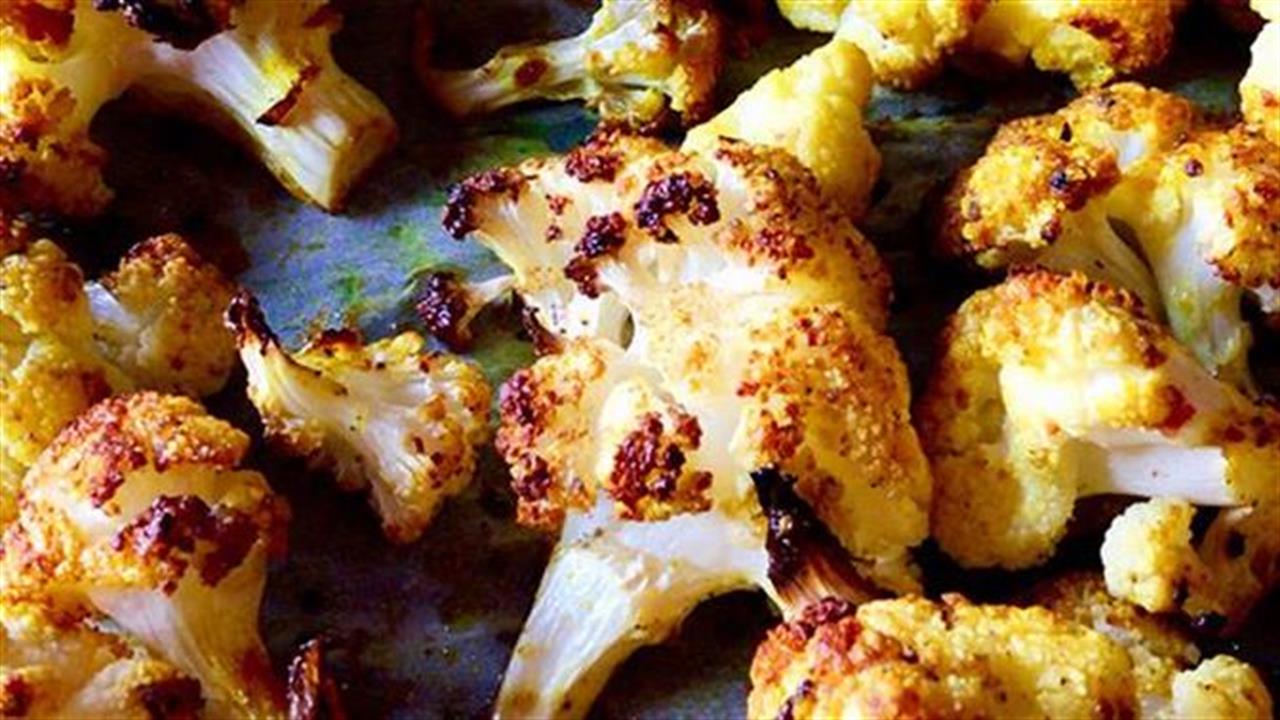 Για 4 άτομα ως συνοδευτικό. Προθερμαίνουμε τον φούρνο στους 180ο C στη λειτουργία του αέρα. Πλένουμε δύο μικρά κουνουπίδια ή ένα μεγάλο, αφαιρούμε τα φύλλα και το κάτω σκληρό μέρος των κοτσανιών και χωρίζουμε τα “μπουκετάκια”. Τα αραδιάζουμε στη λαμαρίνα του φούρνου που έχουμε στρώσει με αντικολλητικό χαρτί, τα αλείφουμε με λίγο έξτρα παρθένο ελαιόλαδο (όχι παραπάνω από 2 κ.σ.) και τα πασπαλίζουμε με χοντρό θαλασσινό αλάτι, χοντροτριμμένο μαύρο πιπέρι ή ποικιλία πιπεριών, κύμινο, κουρκουμά, καπνιστή πάπρικα και λίγο μπούκοβο (βλ. tips). Τα ψήνουμε για περίπου 25΄-30΄, μέχρι τα μπουκετάκια του κουνουπιδιού να «αρπάξουν» κατά τόπους και να τρυπιούνται, παραμένοντας όμως σχετικά τραγανά. Πασπαλίζουμε με ψιλοκομμένο μαϊντανό και σερβίρουμε χλιαρά ή σε θερμοκρασία δωματίου.