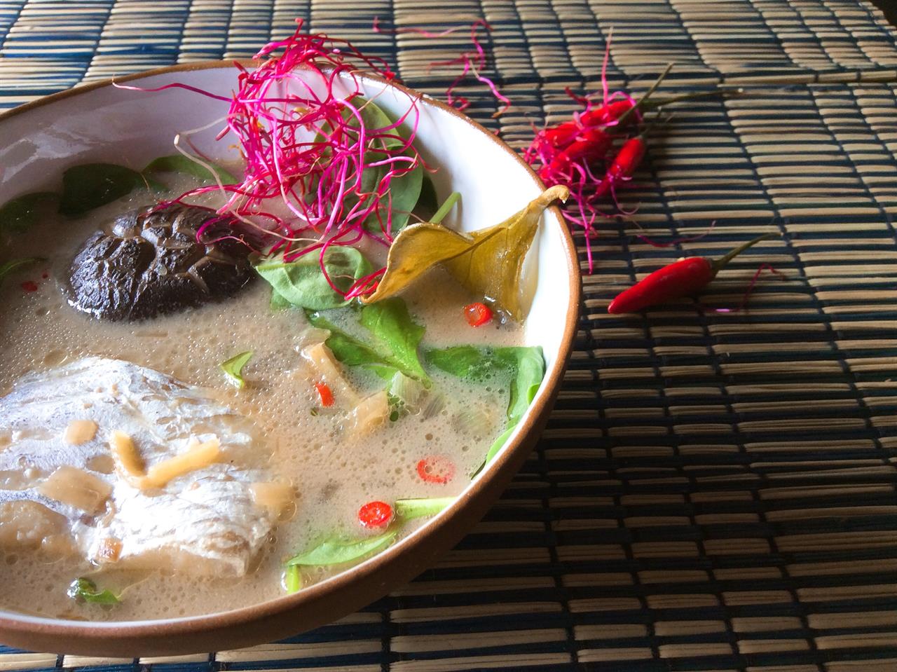 Για 4 άτομα. Μουλιάζουμε 4 μανιτάρια shiitake σε ζεστό νερό για 30΄. Τα σουρώνουμε και κρατάμε το ζουμί. Κόβουμε το σκληρό μέρος των κοτσανιών τους. Κόβουμε σε λεπτά μπαστουνάκια 1 μεγαλούτσικο κομμάτι ginger. Αφαιρούμε τα δύο εξωτερικά φύλλα από 2 μίσχους λεμονόχορτου και τους κόβουμε στα 3. Ψιλοκόβουμε 1 κρεμμύδι τύπου σάλοτ. Με τη λάμα του μαχαιριού σπάμε 1 σκ. σκόρδου. Ψιλοκόβουμε 2 φρέσκιες πιπερίτσες chili και αναλόγως με το πόσο μας αρέσουν τα καυτερά, αφαιρούμε ή όχι τα σπόρια τους, γνωρίζοντας πως είναι αυτά που έχουν τη μεγαλύτερη κάψα. Σε μία κατσαρόλα ζεσταίνουμε σε μέτρια φωτιά λίγο λάδι καρύδας και σοτάρουμε ελαφρά το κρεμμύδι, το ginger, το λεμονόχορτο και το σκόρδο. Προσθέτουμε το ζουμί των μανιταριών, 1 λίτρο νερού και φέρνουμε σε ελαφρύ βρασμό. Προσθέτουμε τα μανιτάρια και 2 φύλλα kaffir lime. Μόλις περάσουν 10΄ περίπου, προσθέτουμε τον χυμό από 1 μοσχολέμονο (lime), 2 κ.σ. fish sauce, 1 κ.σ. soy sauce, τα chilies και σιγοβράζουμε για λίγα λεπτά ακόμη. Αφαιρούμε το λεμονόχορτο, το σκόρδο και τα φύλλα του caffir lime. Προσθέτουμε 150 ml γάλα καρύδας και ανακατεύουμε. Δοκιμάζουμε και διορθώνουμε τη γεύση. Τέλος προσθέτουμε 4 φιλέτα μπακαλιάρου και βράζουμε για 5΄ περίπου, ανάλογα με το πάχος τους. Σε 4 μπολ βάζουμε από 1 μικρή χούφτα φύλλα νεαρού σπανακιού (baby spinach). Γεμίζουμε με ζωμό και από πάνω τοποθετούμε με προσοχή τα φιλέτα του ψαριού. Σερβίρουμε με φρέσκες φύτρες της επιλογής μας, έξτρα ψιλοκομμένα chilies και έξτρα μοσχολέμονο.