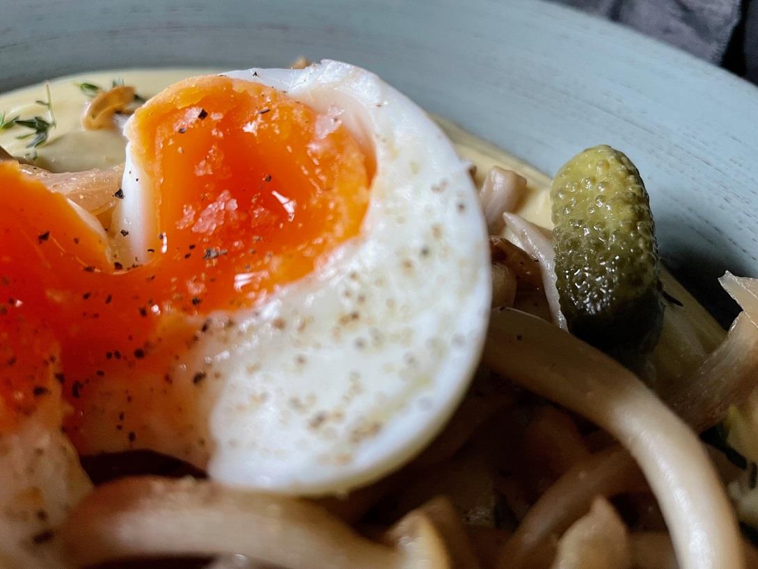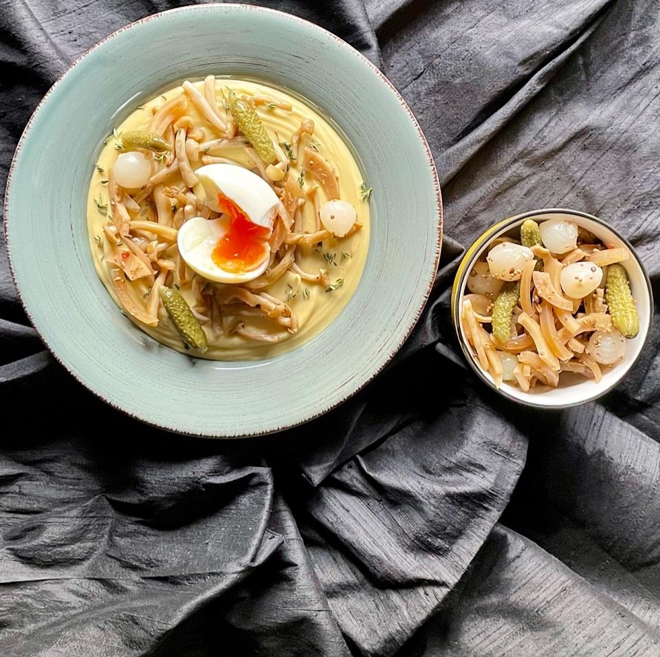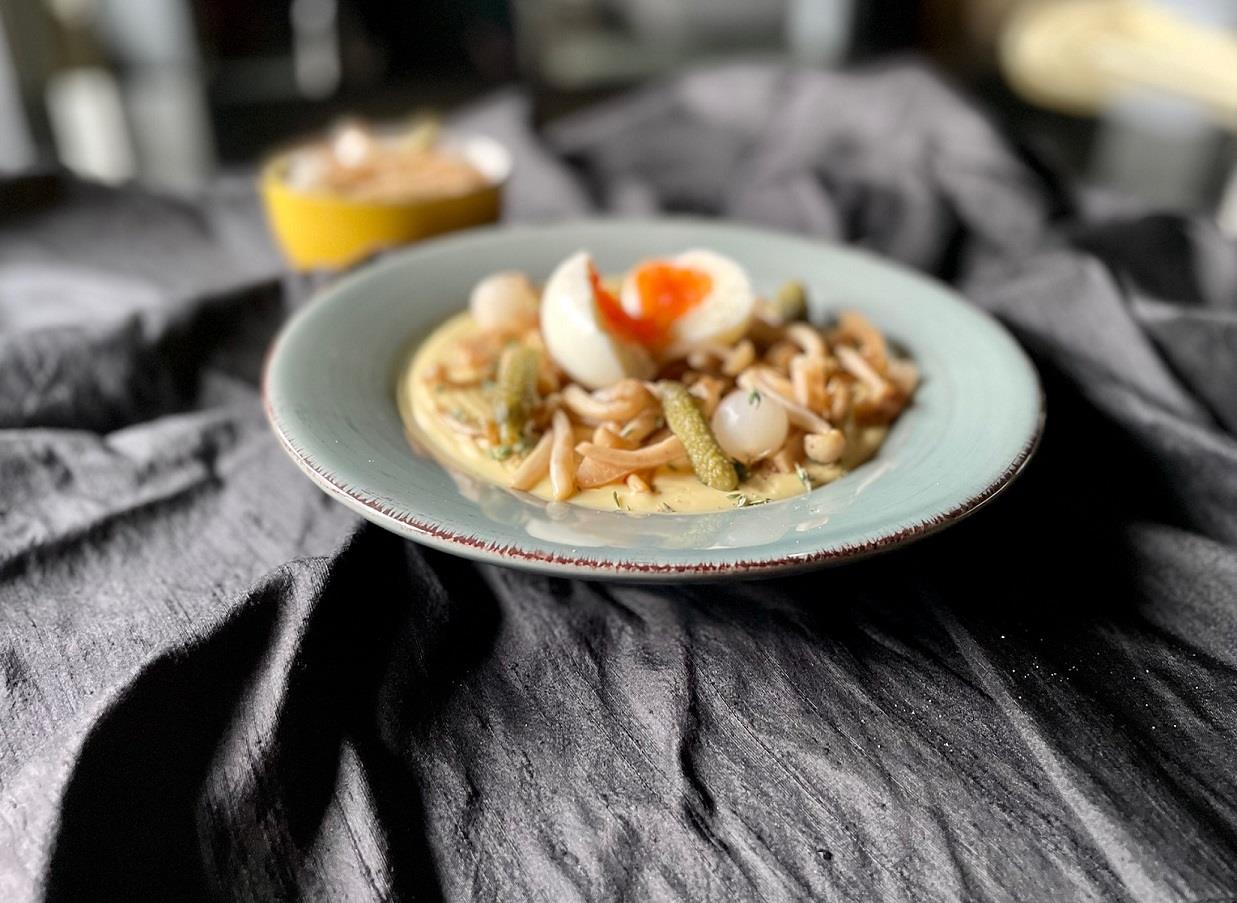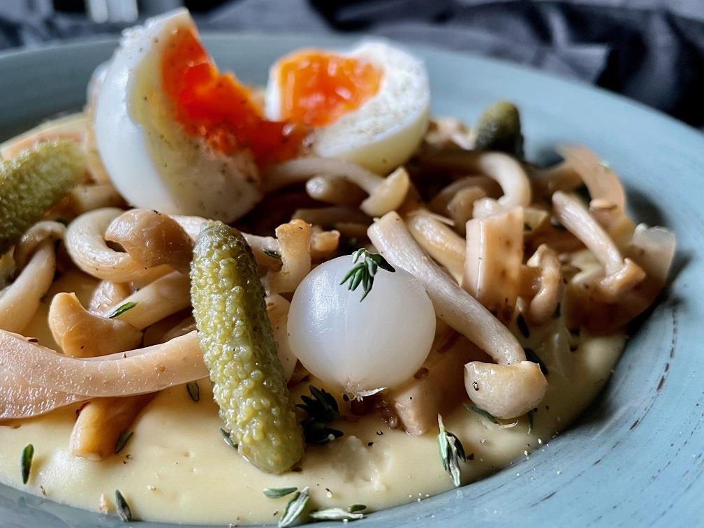 Εδώ η φάβα γίνεται ολοκληρωμένο γεύμα, θρεπτικό, υγιεινό και έξτρα νόστιμο. Η βελούδινη φάβα υποδέχεται τη νοστιμιά των μανιταριών, τα τραγανά ξιδάτα τουρσιά και το αυγό με τον ρέοντα κρόκο. Άλλο να σας λέω, κι άλλο να το τρώτε!